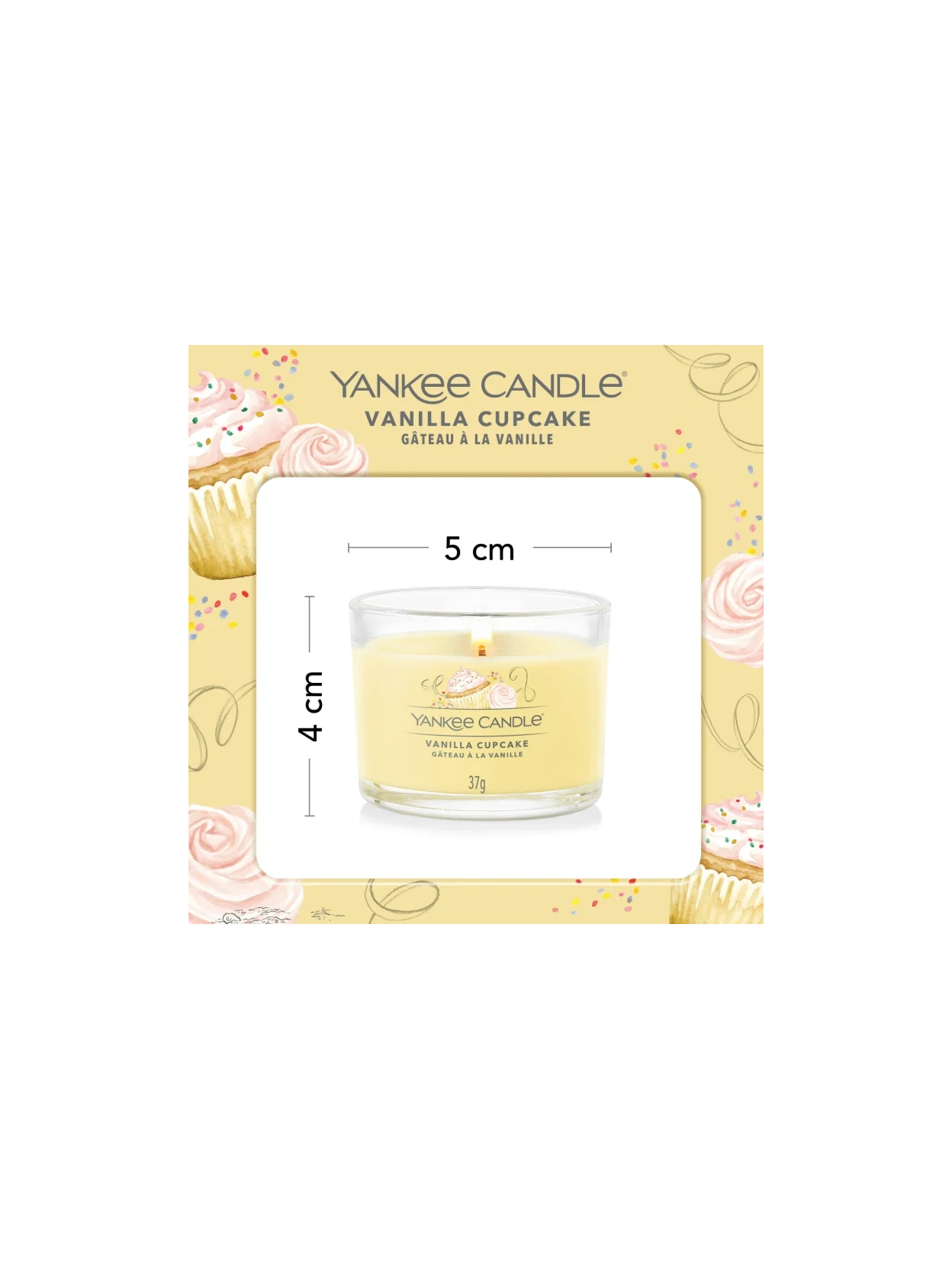 Yankee Candle's Vanilla Cupcake is a glass votive candle that makes your mouth water just by smelling it: the intense scent of freshly baked cupcakes wafts through the air, enveloping the senses with the creamy aroma of vanilla and a bright touch of fresh lemon. On the surface, you can sense the unmistakable sweetness of a soft, sugary glaze, abundant and velvety, just like that of an artisan pastry shop. At the heart, notes of batter and chocolate lend a roundness and deliciousness, while the base notes reveal enveloping nuances of cocoa and vanilla bean, leaving a warm, irresistible, and deeply comforting trail in the air. Vanilla Cupcake is a sweet and spicy fragrance that transforms any space into a corner of pure delight. Perfect for those who love gourmand, cuddly scents rich in personality.