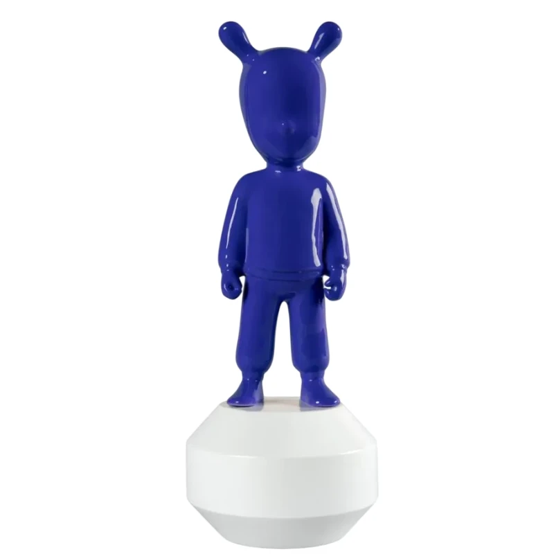 The Guest, Jaime Hayon's iconic character, is dressed in indigo blue in this refined glossy porcelain sculpture. A perfect balance of design, light, and color, designed by Lladró.