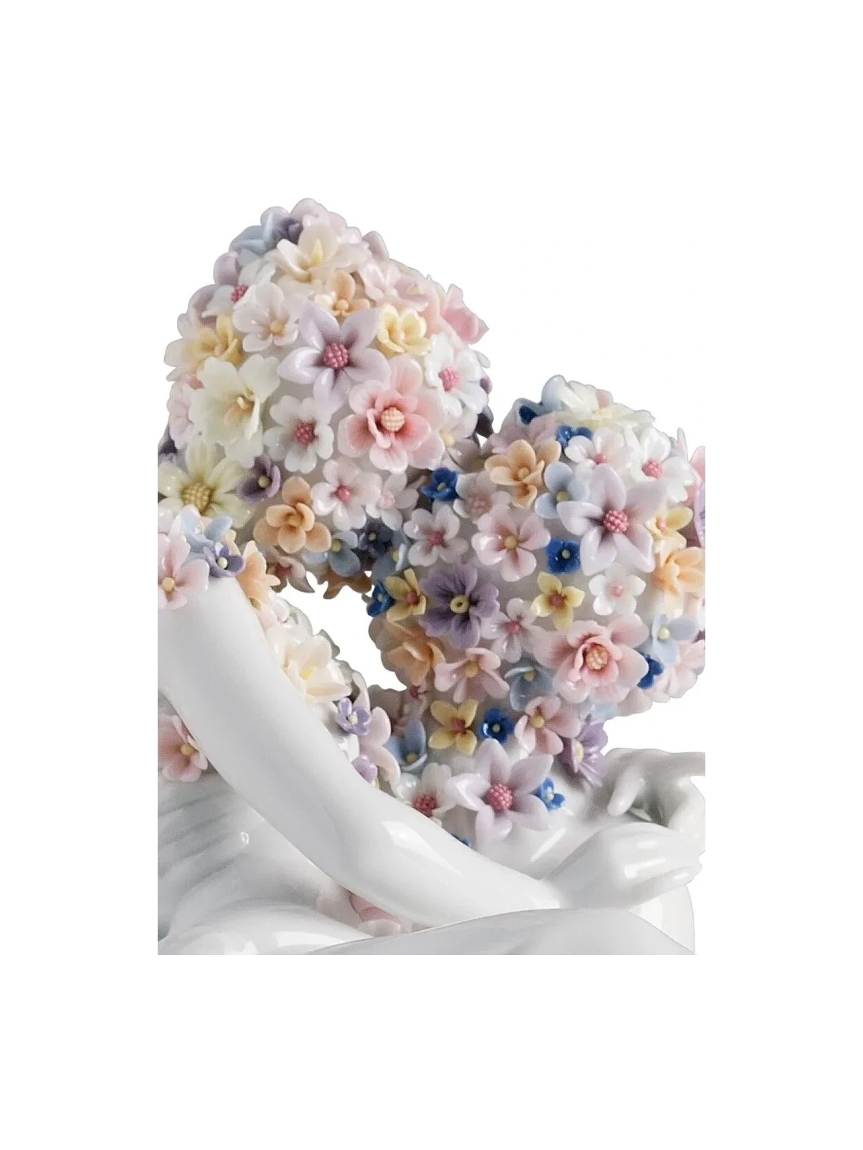 The Love II Flowers Sculpture is part of the third chapter of Lladró's Re-Cyclos project, which transforms existing elements into new artistic creations through collaborations with internationally renowned designers. Clare Page and Harry Richardson, members of the Committee and British designers, reinterpret flowers, animals, and angels from the Lladró catalog, offering a poetic and original vision of the phases of love, the uniqueness of the animal kingdom, and universal curiosity. In this sculpture, the couple's faces are covered in flowers, a symbol of delicacy, harmony, and emotional beauty. The glossy white porcelain enhances elegance and sophistication, while the craftsmanship of sculptor José Puche lends uniqueness and artistic value to the piece.