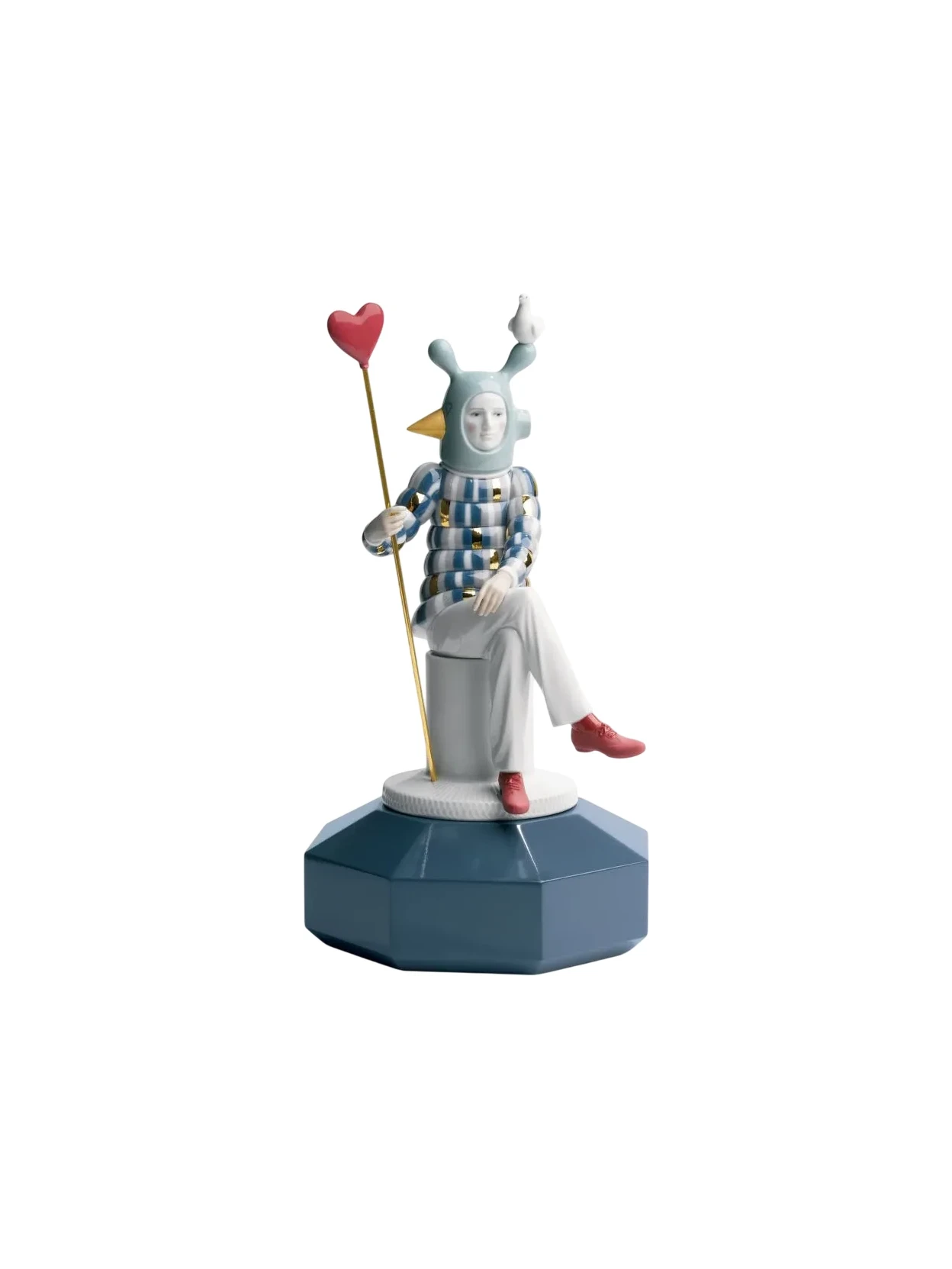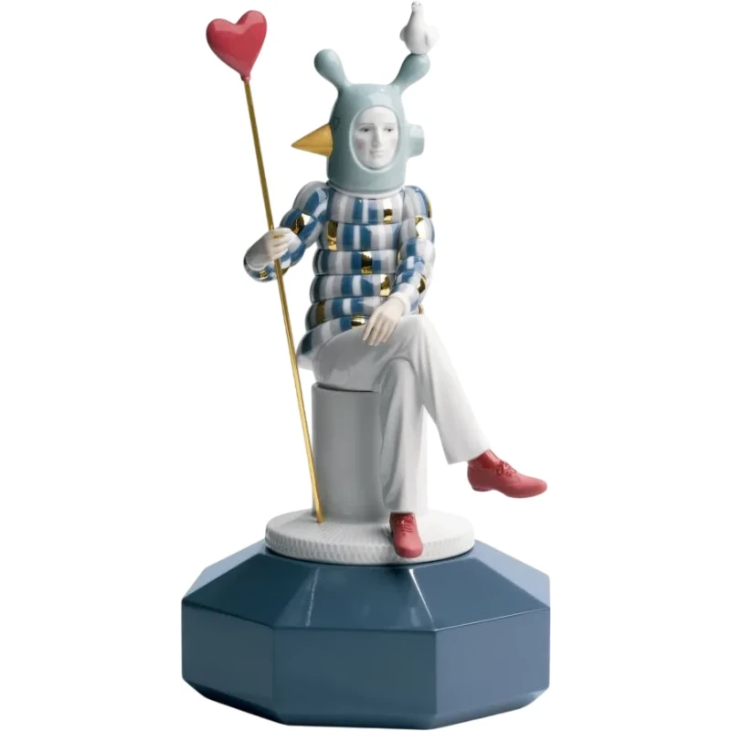 Discover the glossy porcelain sculpture "The Lover III" by Lladró, created by Jaime Hayon. With a blue base, gold details, and touches of red on the heart and shoes, this piece combines elegance, playful fantasy, and modernity. Perfect for enriching your collection with unique style.