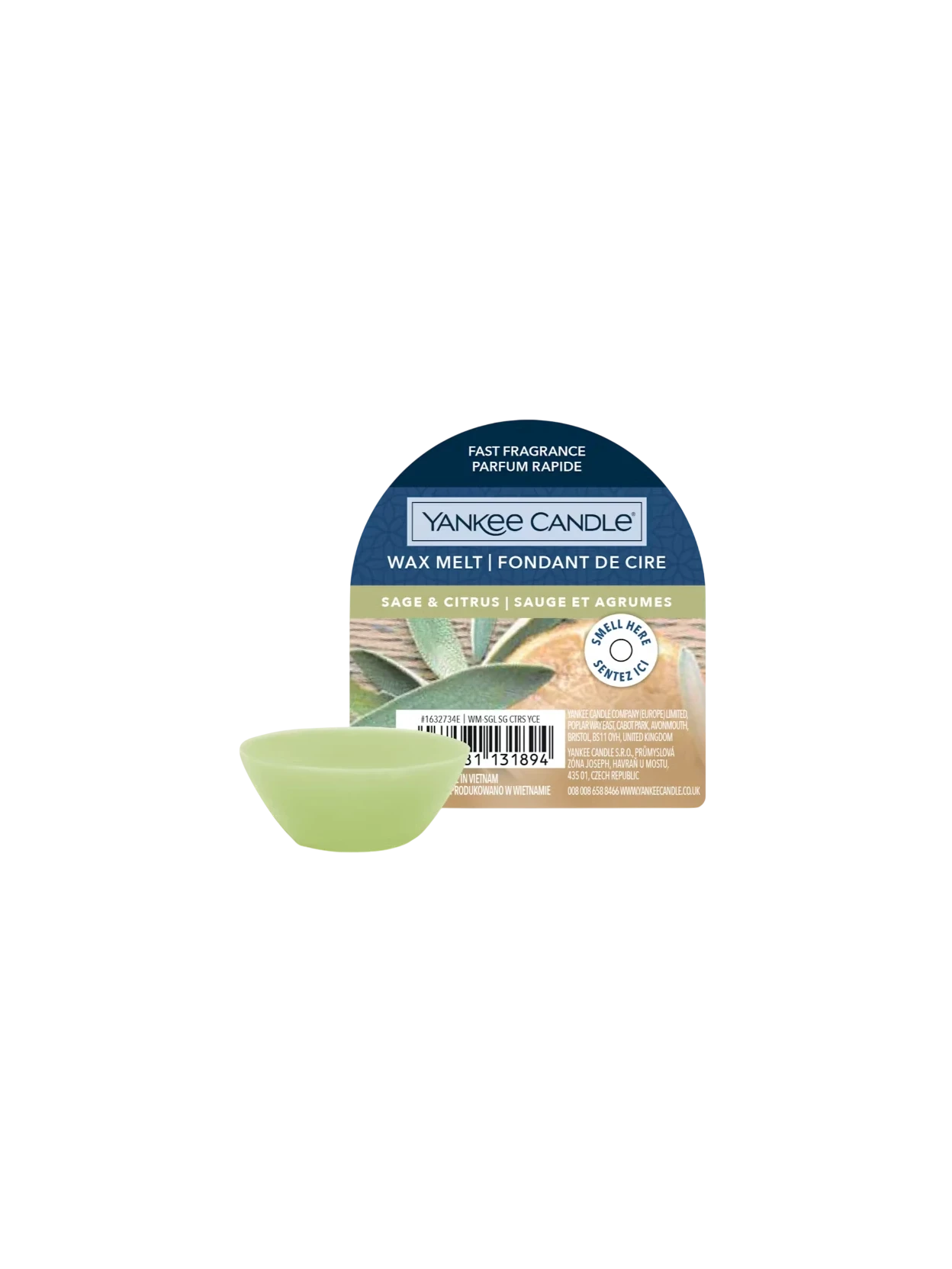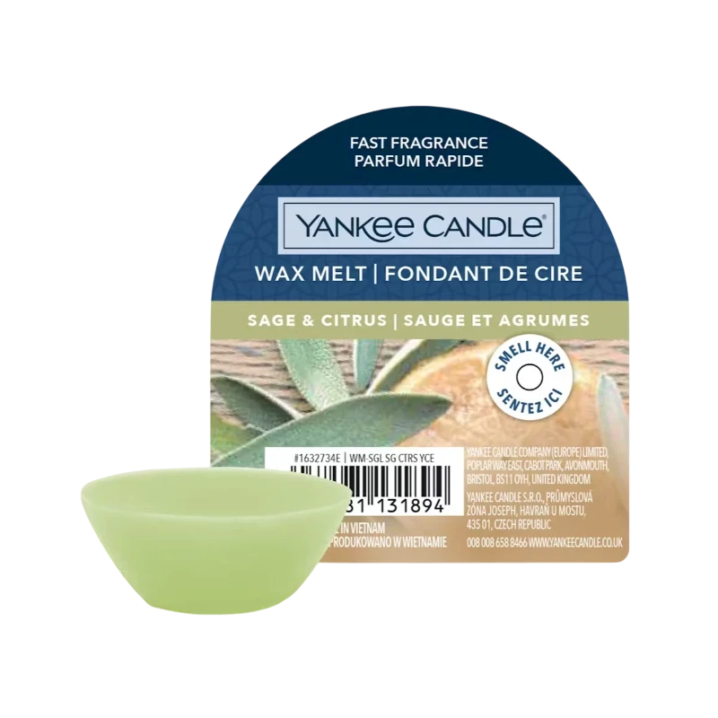 Yankee Candle's Sage & Citrus is a wax tart that celebrates the harmony of nature: vibrant citrus top notes blend with herbaceous accents and lavender, opening to a refined heart of geranium and lavender. Deep patchouli blends with soft powdery notes, musk, and warm woods. A perfect balance of freshness and warmth, energy and tranquility: a citrusy and earthy fragrance designed to bring serenity and well-being to any space.