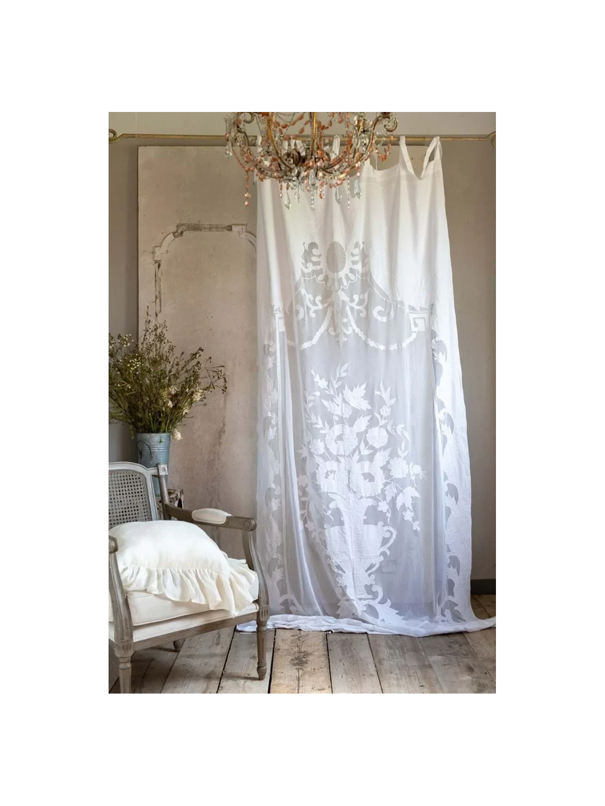 Elegant 100% cotton curtain, ideal for classic, shabby chic, and Provençal settings. With refined center and side embroidery, it brings light and charm to the living room or bedroom. Dimensions: 140x290 cm. Easy to attach with ties.