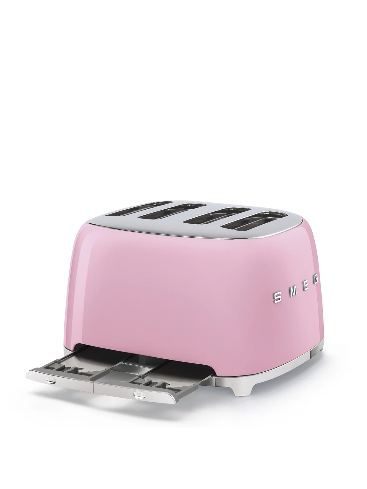Smeg's glossy pink 4 x 4 toaster with a 50's Style aesthetic is the perfect ally for those who want to combine iconic design, color, and high performance. The four independent slots and two multifunction interfaces allow you to toast up to four slices simultaneously, choosing different settings for each pair of slots and ensuring even browning thanks to automatic centering. The 6 browning levels and the reheat, defrost, and bagel functions offer maximum versatility for any type of bread. Automatic ejection at the end of the cycle ensures convenience and safety, while the two polished stainless steel crumb trays simplify cleaning. The glossy pink finish, combined with Smeg's signature 50's retro design, brings brightness, elegance, and personality to the kitchen, transforming this toaster into a truly distinctive and functional furnishing element.