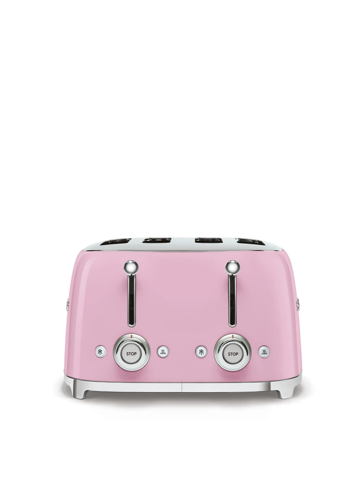The Smeg 4 x 4 toaster in glossy pink with a 50's-style aesthetic combines style, elegance, and practicality. With four independent slots and two separate control panels, it toasts up to four slices at once with six browning levels and defrost, reheat, and bagel functions, for a flawless and colorful breakfast.
