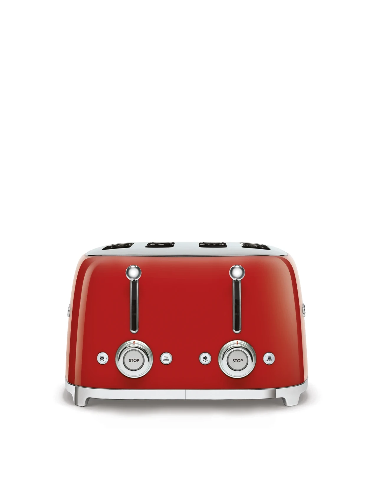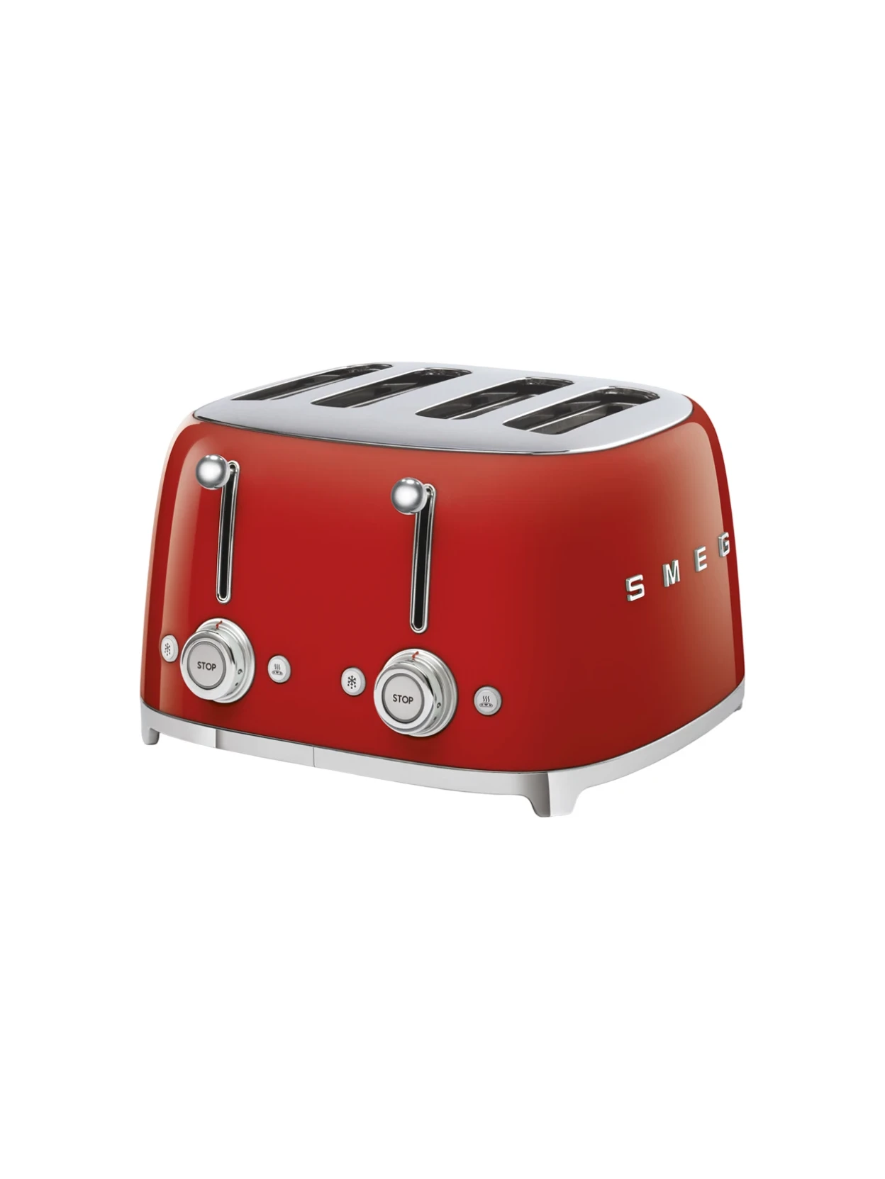 The Smeg 4 x 4 toaster in glossy red with a 50's-style aesthetic brings energy, style, and functionality to your kitchen. With four independent slots and two separate control panels, it toasts up to four slices at once with six browning levels and defrost, reheat, and bagel functions, for a convenient and distinctive breakfast.