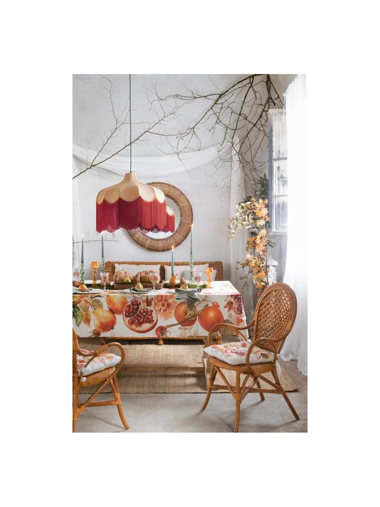 The Persimmon collection tablecloth, made of 100% cotton and measuring 150 x 340 cm, brings all the magic of autumn to the table. The soft, natural fabric elegantly envelops the table, while the decorative motif, depicting pomegranates and pears suspended on branches, evokes the warm colors and fruits of the season. Perfect for family lunches, dinners with friends, or special occasions, this tablecloth combines aesthetics and practicality, lending a welcoming and refined atmosphere to your dining room. Thanks to its refined design and quality material, the Persimmon tablecloth is not only a decorative element, but also a durable accessory that celebrates the beauty of nature and the autumn season.