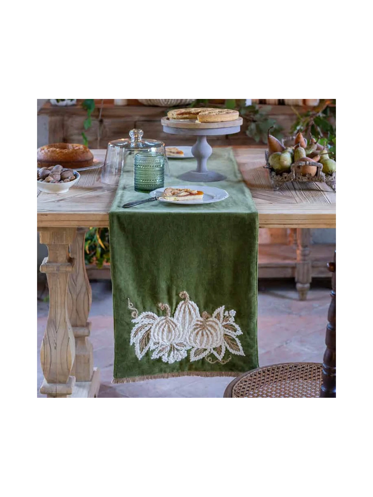 Blanc Mariclò's Zucche di Sogno runner, 50x140 cm, in green velvet with cream-colored pumpkin and leaf embroidery. Finished with a tone-on-tone fringe for an elegant, autumnal look.