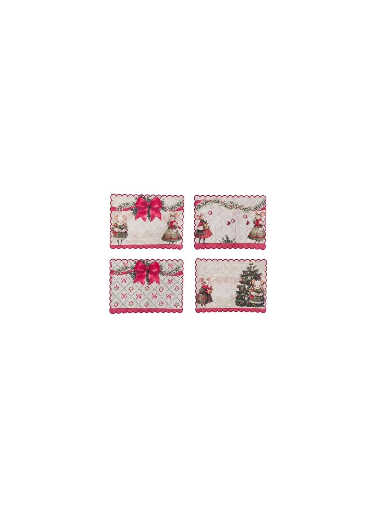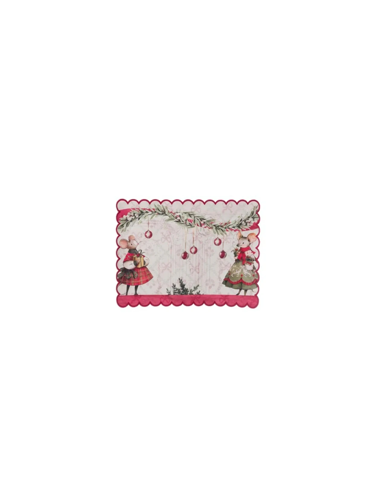 Create a sweet and festive atmosphere with the Blanc MariClò placemat from the Favola di Natale collection. Made of 100% cotton, it combines elegance and Christmas spirit with a delicate beige background and a red lace border framing the design. It depicts two cute little mice exchanging Christmas gifts, a detail that evokes the magic of the holidays and the romantic style typical of the Blanc MariClò brand. Perfect for Christmas breakfast, to decorate the table, or as a refined gift idea, it adds a vintage and welcoming touch to your home.