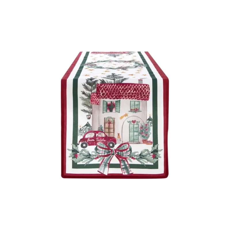 Table runner by Blanc Mariclò from the Natale Italiano collection. Festive and romantic, made of soft cotton with Christmassy prints of houses, wreaths, and Christmas trees. Perfect for a warm and inviting table.
