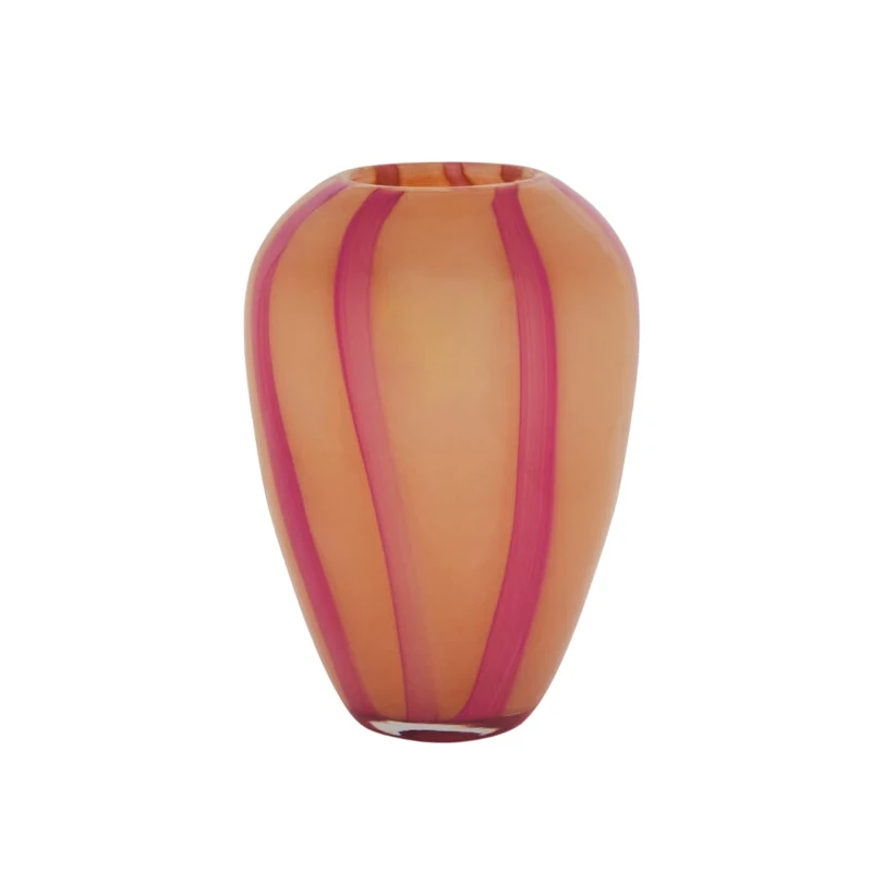 The Sfumature Vase by Henriette is an elegant hand-blown glass creation, characterized by harmonious lines and a refined blush color that illuminates and enhances any space. Measuring 19x27 cm, it is perfect as a decorative accessory, a centerpiece, or for displaying fresh and dried flowers.