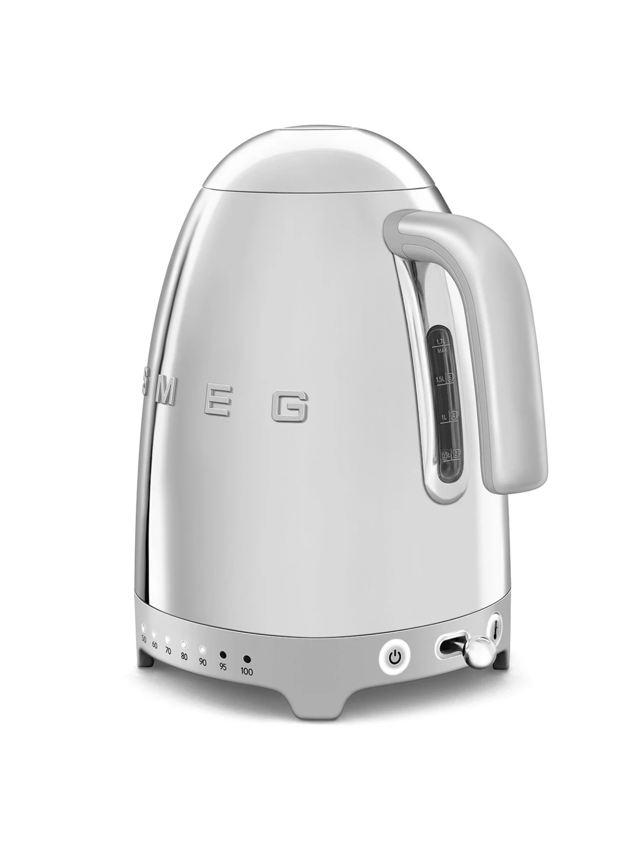 Bollitore elettrico Smeg in acciaio inox lucido, con 7 livelli di temperatura selezionabili (50–100°C) e funzione Keep Warm fino a 20 minuti. Capacità 1,7 litri (fino a 7 tazze), apertura Soft Opening, base girevole a 360° e autospegnimento automatico. Eleganza retrò anni ’50 con prestazioni precise e affidabili.