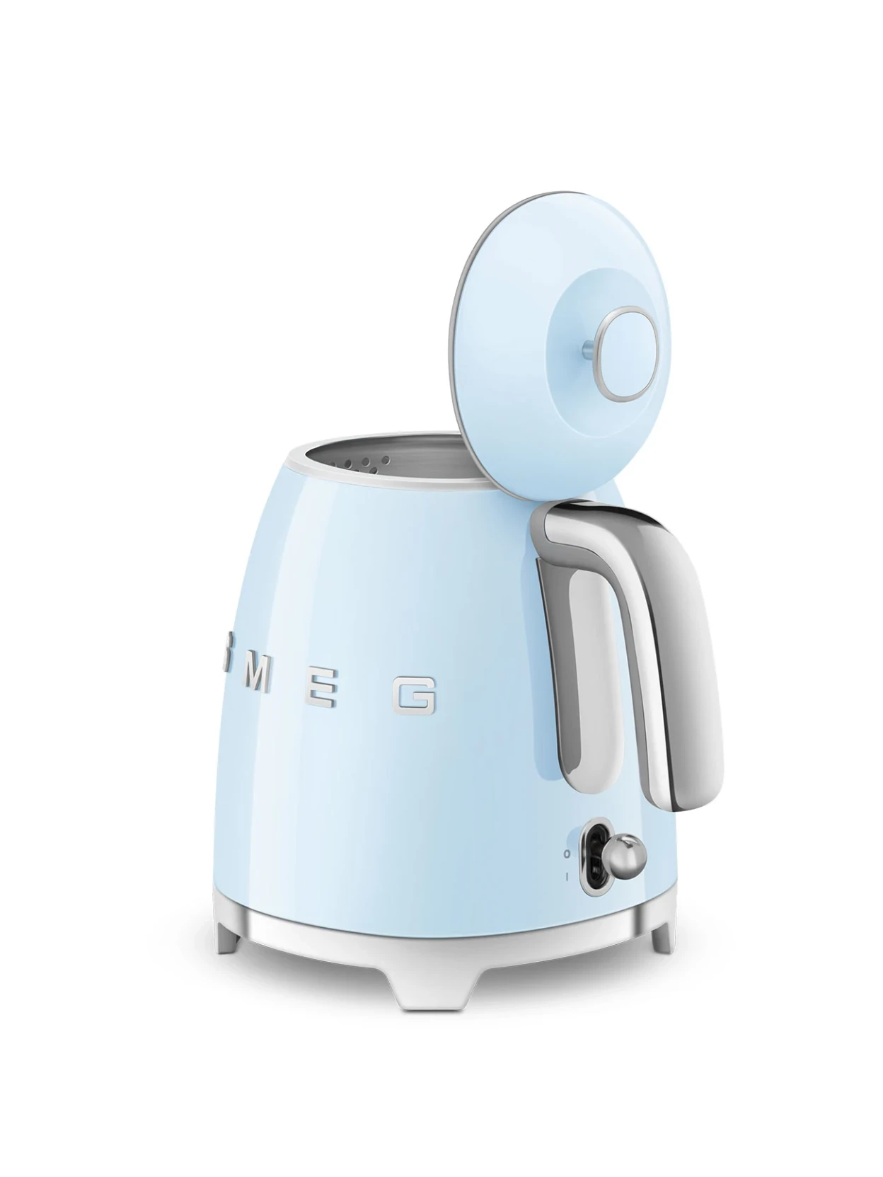 Compatto e funzionale, il mini bollitore Smeg in azzurro lucido ha capacità 0,8L (3 tazze), doppia parete in acciaio inox, base girevole a 360°, apertura manuale e autospegnimento automatico a 100°C. Design iconico anni ’50 per piccoli spazi con stile.