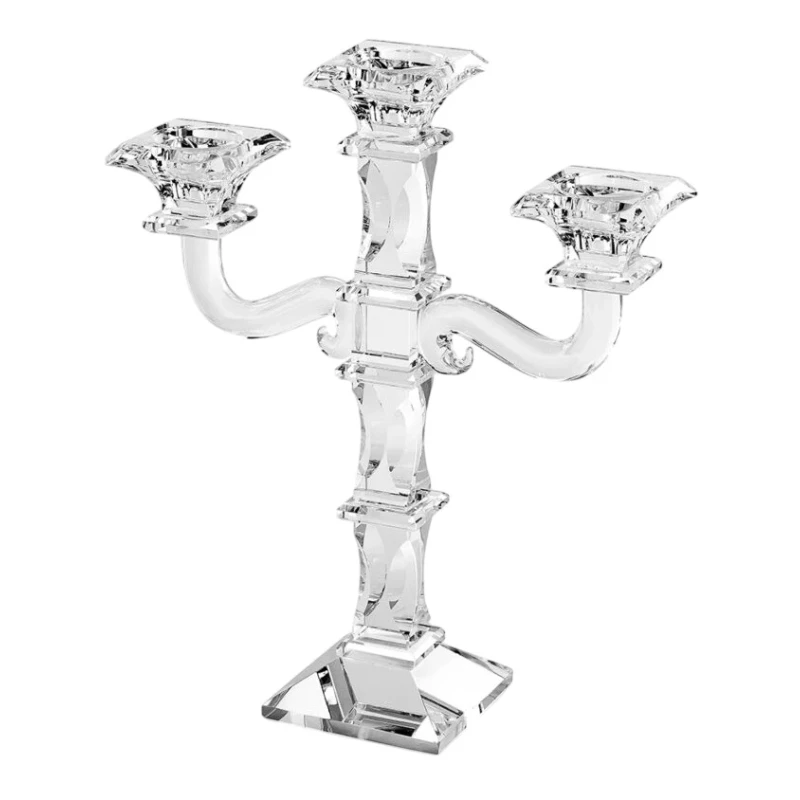 Un candeliere raffinato in cristallo trasparente, dal design elegante e luminoso. Le tre fiamme riflettono la luce creando un’atmosfera calda e preziosa.