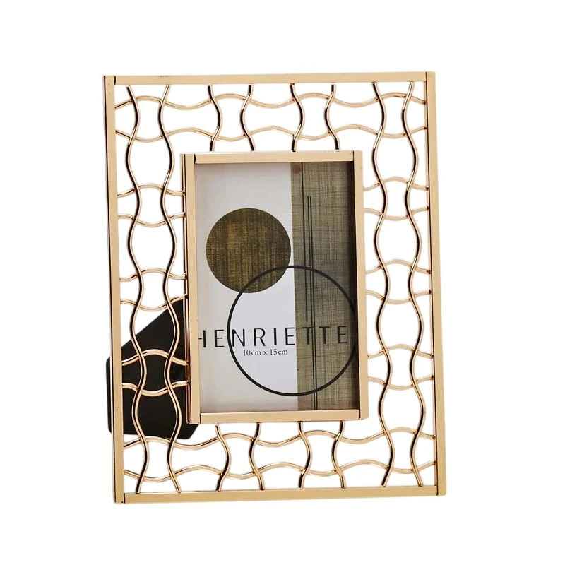 Cornice in metallo dorato firmata Henriette: linee dinamiche e raffinate per dare luce e movimento ai tuoi ricordi più preziosi.