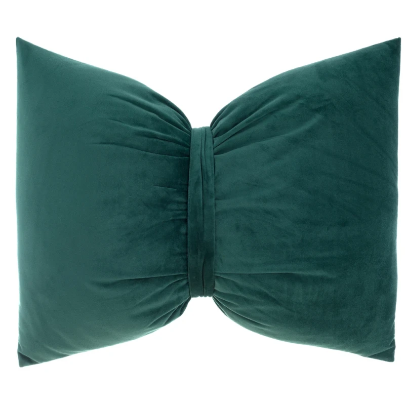 Cuscino fiocco di Blanc Mariclò della collezione Morbido Sonno realizzato in velluto verde intenso, morbido e romantico, perfetto per aggiungere un tocco elegante e shabby chic a letto o divano.