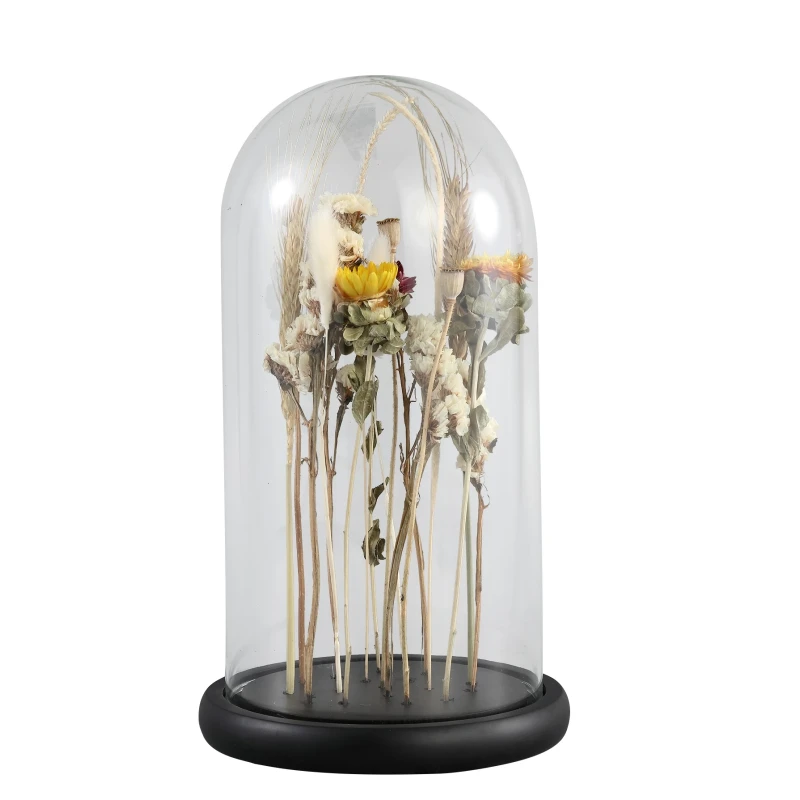 Eleganza naturale e fascino senza tempo: la campana di vetro con base in legno e fiori secchi è una decorazione raffinata e romantica, perfetta per impreziosire ogni ambiente con un tocco delicato e autentico.