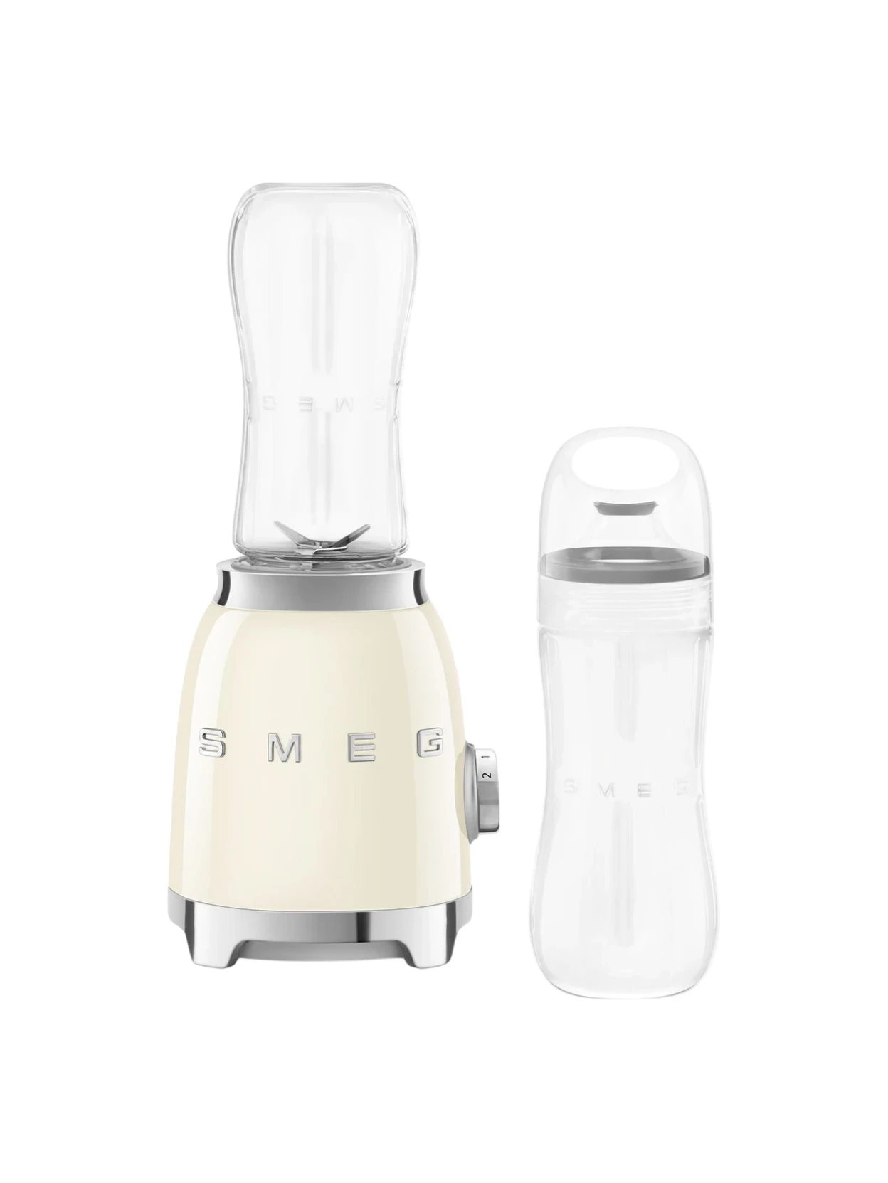 Il frullatore multifunzione compatto di Smeg in finitura panna è perfetto per preparare frullati sani e veloci da gustare anche fuori casa. Compatto, pratico e intuitivo, dispone di due velocità di lavorazione e include due bottiglie To-Go in Tritan™ Renew da 600 ml, ideali per smoothie e milkshake da portare sempre con te. Il design iconico Smeg in stile 50’s, nella raffinata finitura panna, dona eleganza e armonia a ogni cucina.