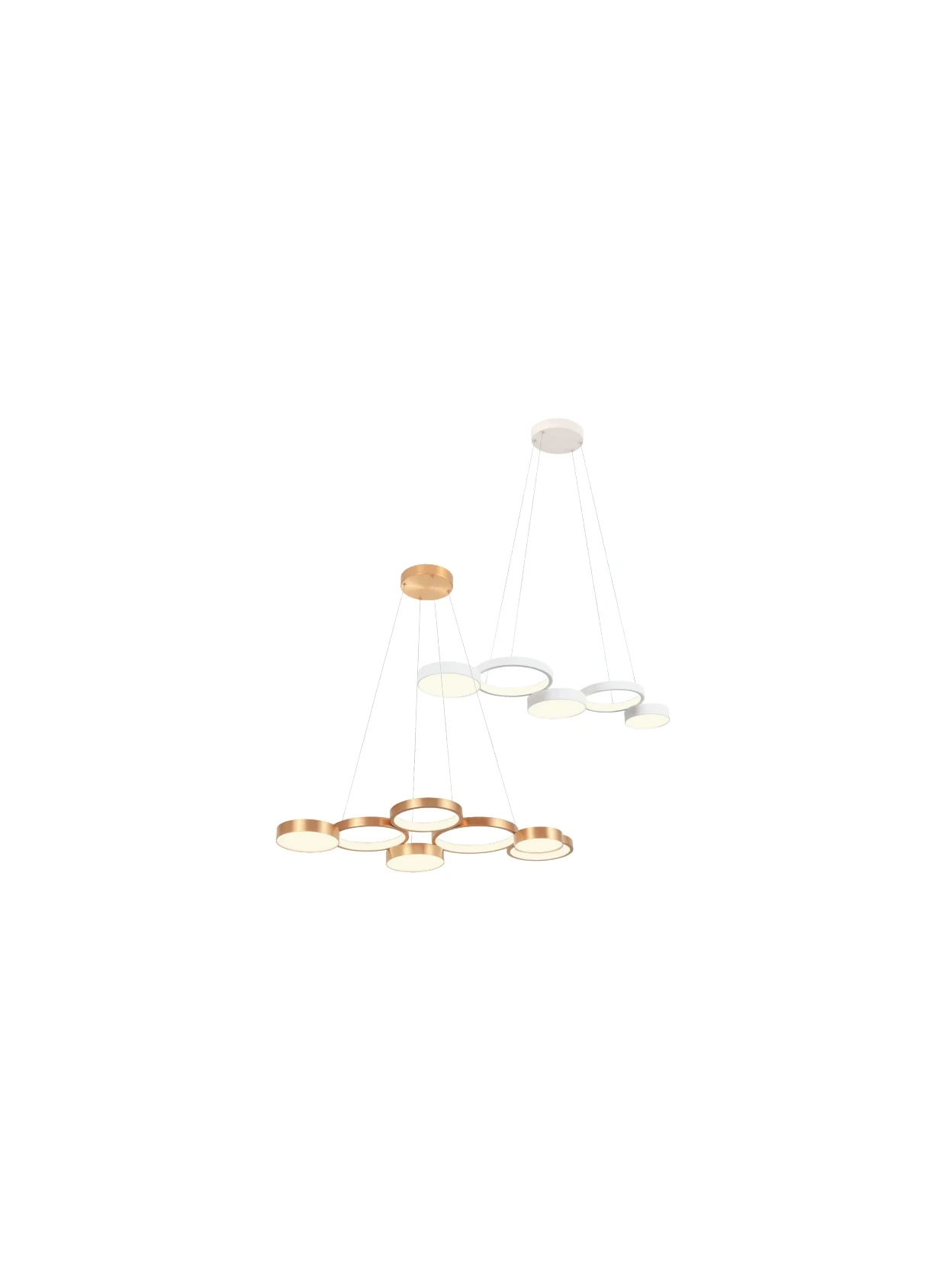 Cronos di Redo Group è una lampada a sospensione per interni con luce indiretta, struttura in alluminio verniciato bianco opaco e diffusori in acrilico satinato. Ideale per ambienti moderni e luminosi. LED SMD integrati, dimmerazione 3 step, temperatura colore 3000K, CRI 90, IP20, Classe I, alimentazione 220–240V.