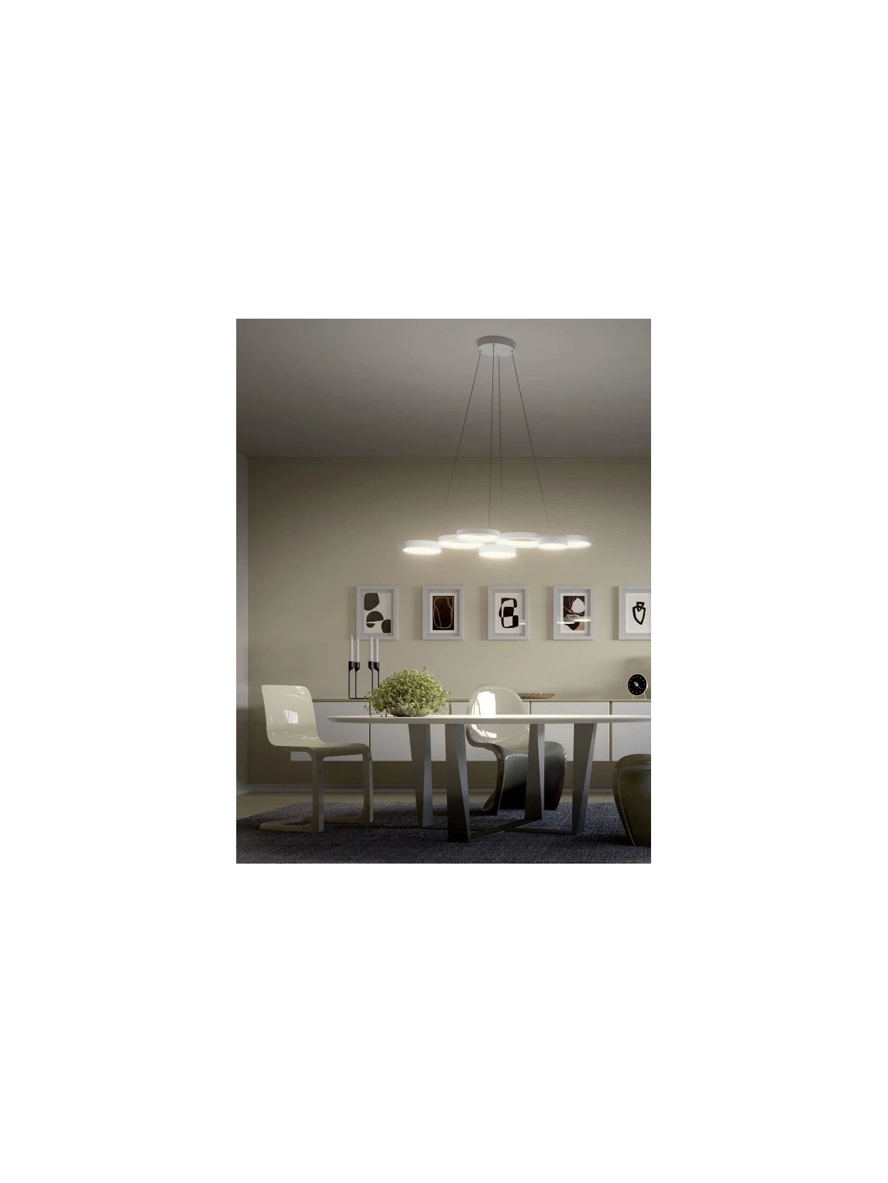 Cronos di Redo Group è una lampada a sospensione per interni con luce indiretta, struttura in alluminio verniciato nero opaco e diffusori in acrilico satinato. Ideale per ambienti moderni e luminosi. LED SMD integrati, dimmerazione 3 step, temperatura colore 3000K, CRI 90, IP20, Classe I, alimentazione 220–240V.