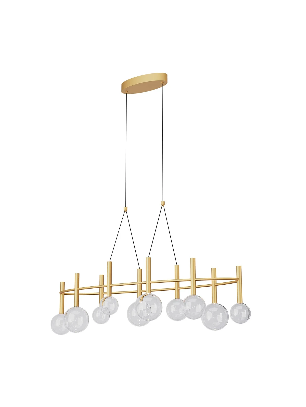La lampada a sospensione ovale Bolla Oro Opaco di Redo Group illumina con eleganza grazie al corpo in metallo e alluminio verniciato e al diffusore in vetro soffiato trasparente. LED COB da 44W per una luce calda e avvolgente.