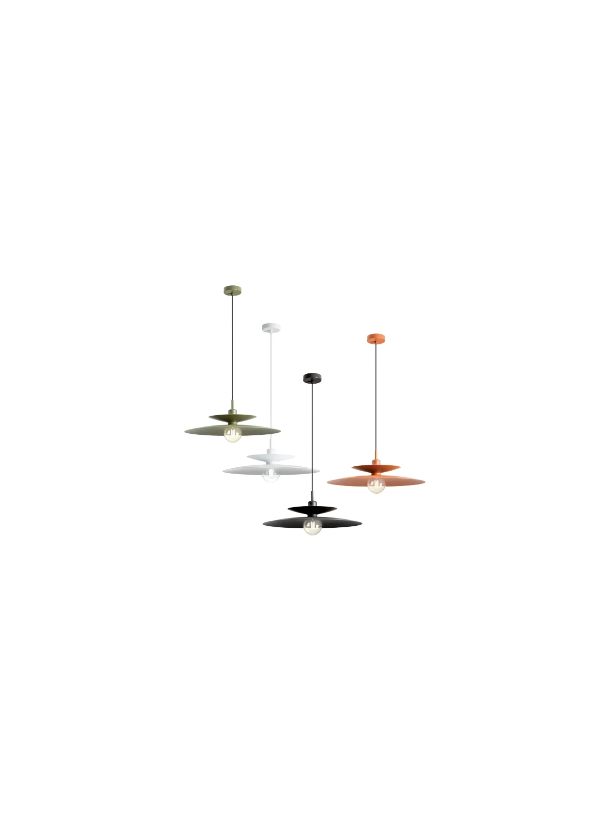 Lampada a sospensione con struttura in alluminio bianco opaco.