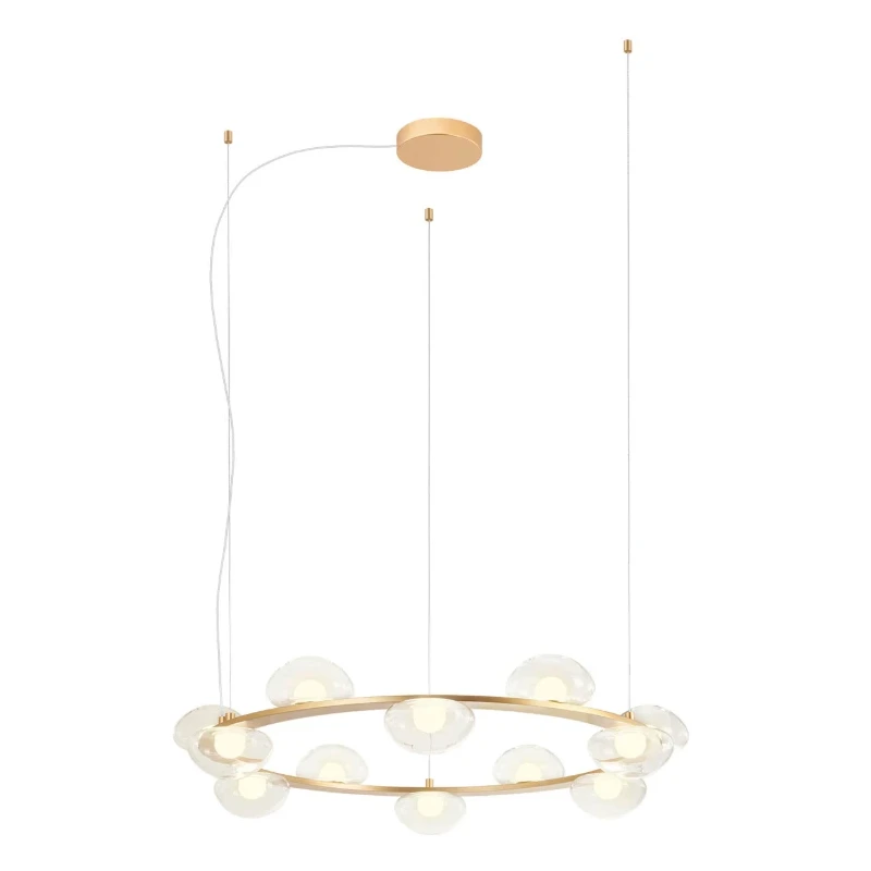 Sinclair Circolare di Redo Group è una sospensione LED da interno in metallo verniciato oro opaco, con diffusori in vetro Pyrex bianco satinato e trasparente, disponibile nelle versioni a 6, 8 o 12 globi. Offre luce calda 3000K, alta resa cromatica CRI 93, regolabile tramite dimmer TRIAC e prestazioni luminose fino a 7791 lm, ideale per ambienti di design eleganti e contemporanei.