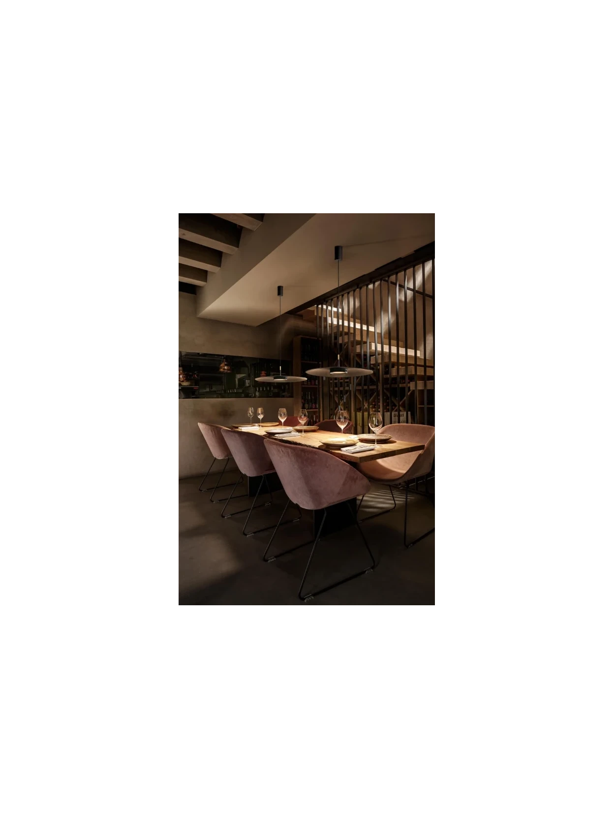 Overfly Plus è la lampada a sospensione ideale per ristoranti, tavoli da pranzo e spazi moderni. Il fascio luminoso diretto verso il basso è reso confortevole dal filtro a nido d’ape anti-abbagliamento integrato nella sorgente luminosa. Il design iconico, con sottile piatto leggermente concavo, richiama la forma degli UFO, mentre le incisioni godronate incrociate sul perimetro del disco inferiore creano raffinati giochi di luce, aggiungendo un tocco di eleganza e personalità.