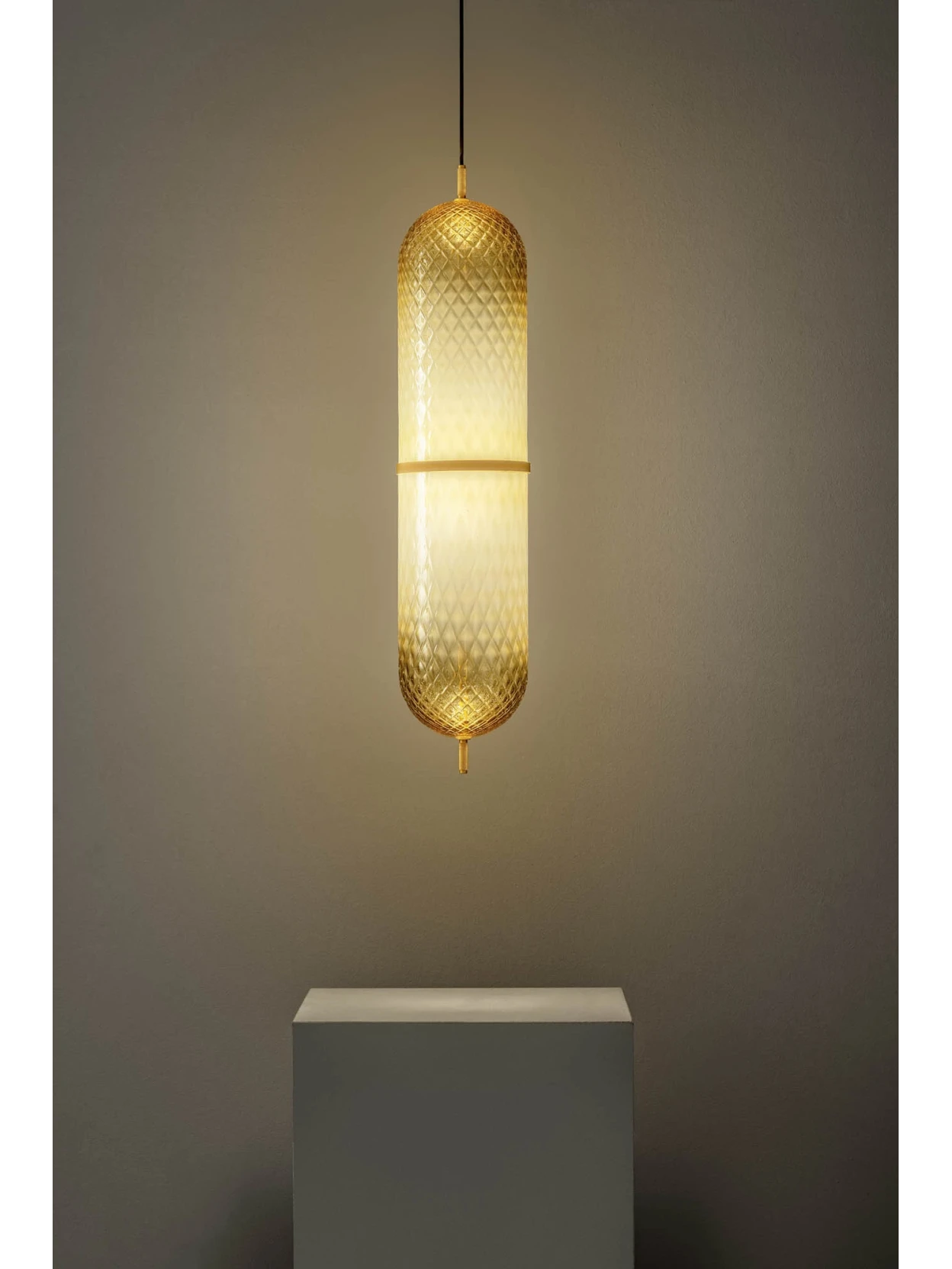 La lampada Curuba Combo di Olev trasforma il vetro in un materiale sorprendentemente morbido grazie alla lavorazione Balloton, che crea una texture elegante simile a un tessuto imbottito. La luce avvolgente e la cura dei dettagli Made in Italy rendono questa sospensione un elemento di design capace di catturare subito lo sguardo e valorizzare qualsiasi ambiente con stile contemporaneo.