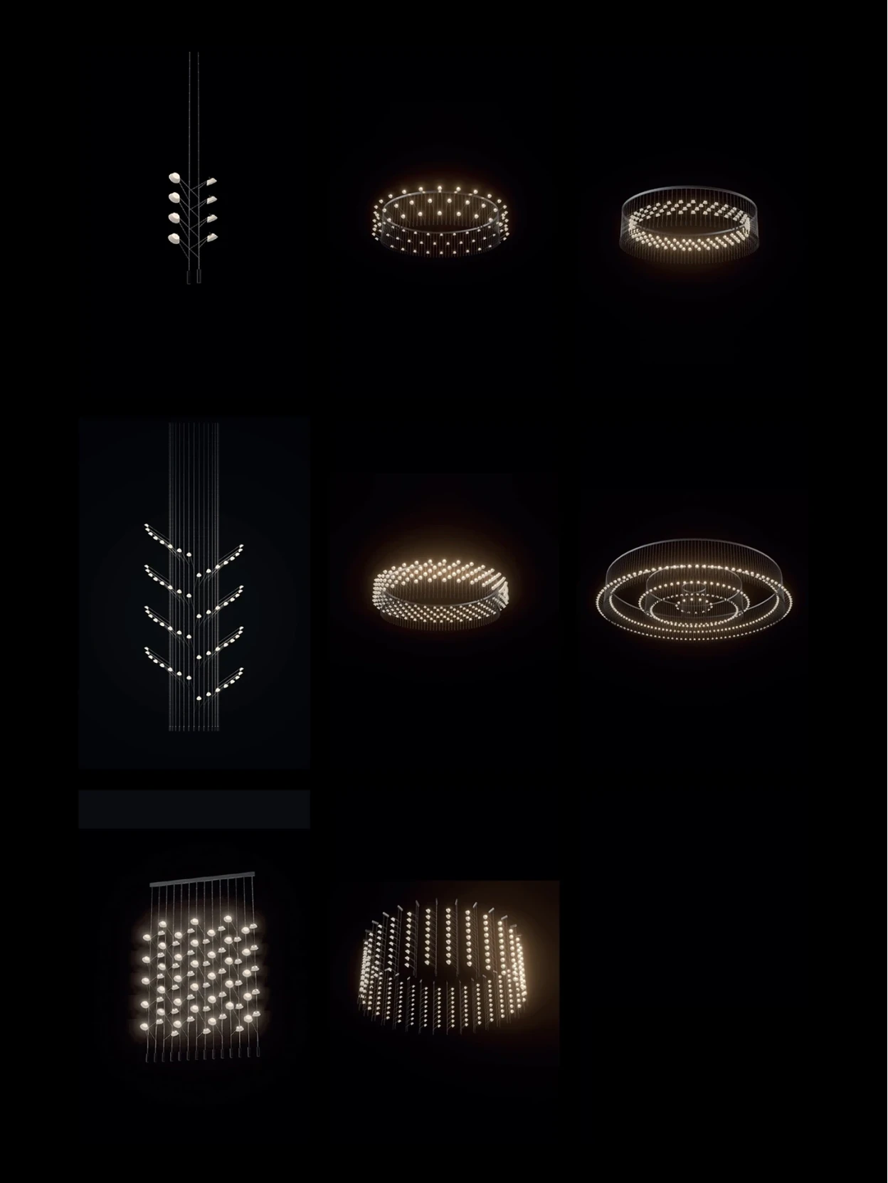 La struttura di base è costituita da cavi metallici elettrificati fissati al rosone o a un binario e tenuti in costante tensione da contrappesi. I corpi delle lampade sono posizionati sui cavi tramite due leggerissimi bracci che sostengono la testa luminosa e sono caratterizzati da una spirale all’estremità. Il montaggio è semplice e rapido, con un gesto che riassume l’essenza del progetto.