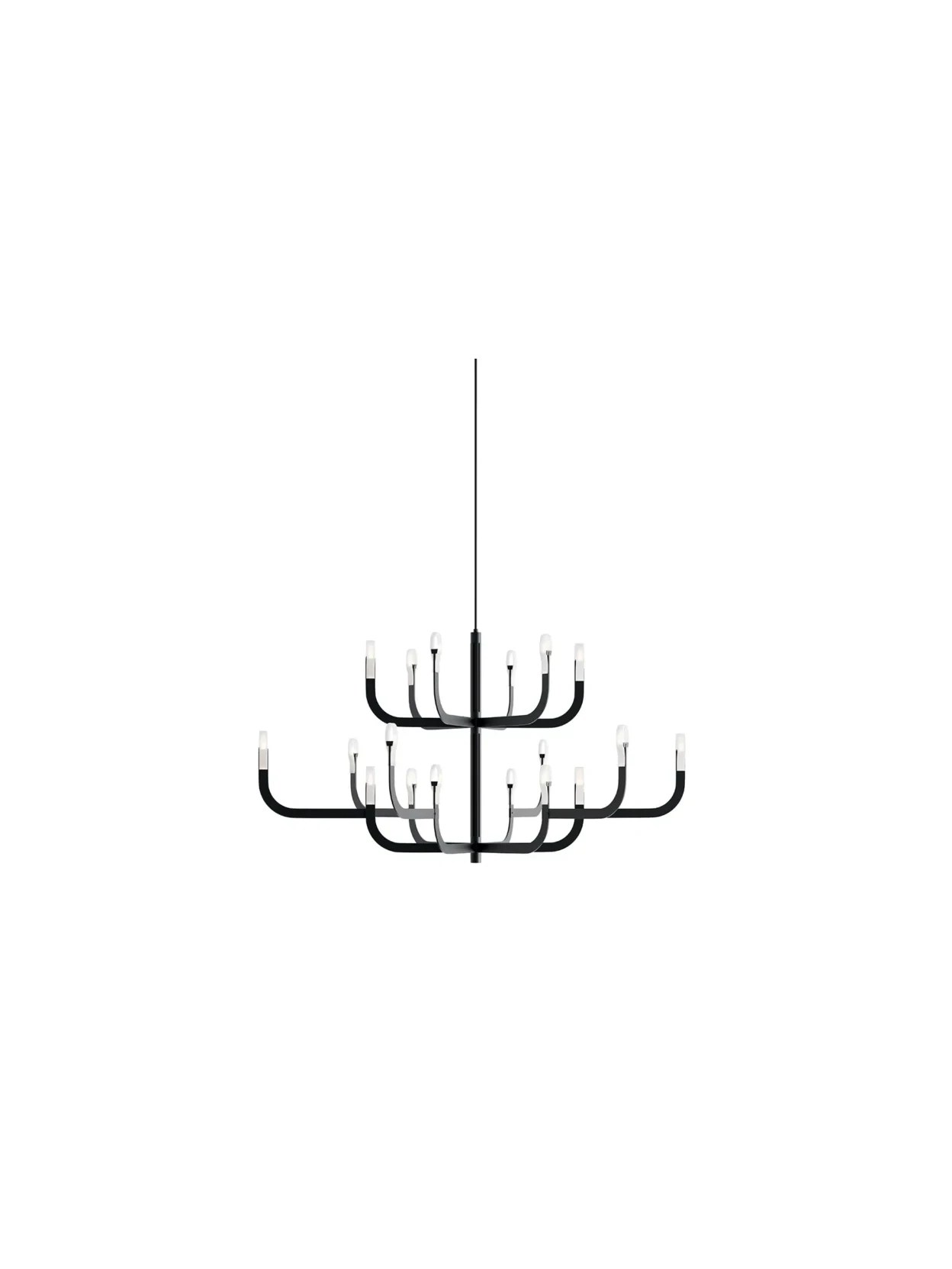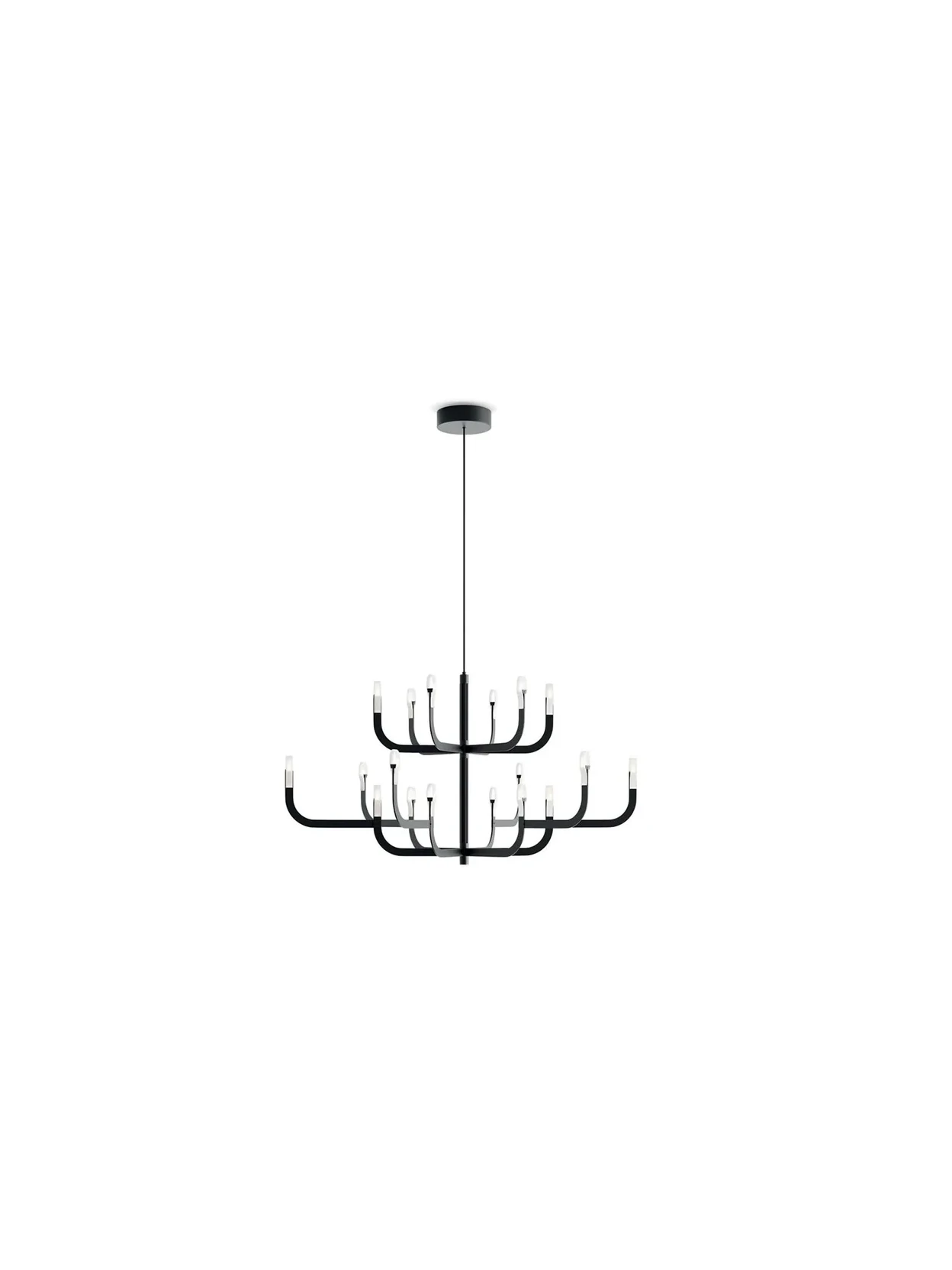 J-us di Luceplan nella configurazione G è una soluzione di illuminazione di design pensata per chi cerca flessibilità compositiva e forte impatto estetico. Il cuore del progetto è la struttura cilindrica centrale, che funge da binario elettrificato innovativo sul quale possono essere fissati e fatti scorrere liberamente i bracci luminosi, singoli o doppi. Questo sistema consente di personalizzare la composizione della lampada, adattandola alle esigenze funzionali e allo stile dello spazio.