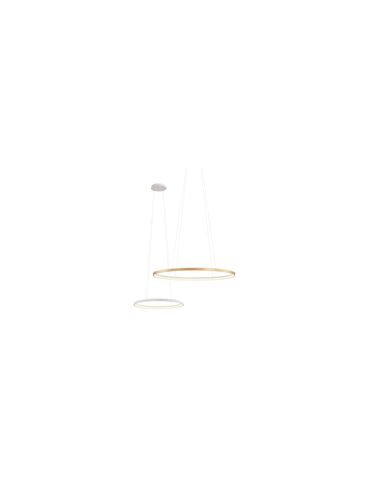 Lampada a sospensione a luce diretta/indiretta con struttura in alluminio e metallo oro opaco. Il diffusore per la luce diretta è in acrilico opalino bianco, mentre per la luce indiretta è in polistirolo. É possibile scegliere la temperatura colore da bianco caldo a bianco neutro.