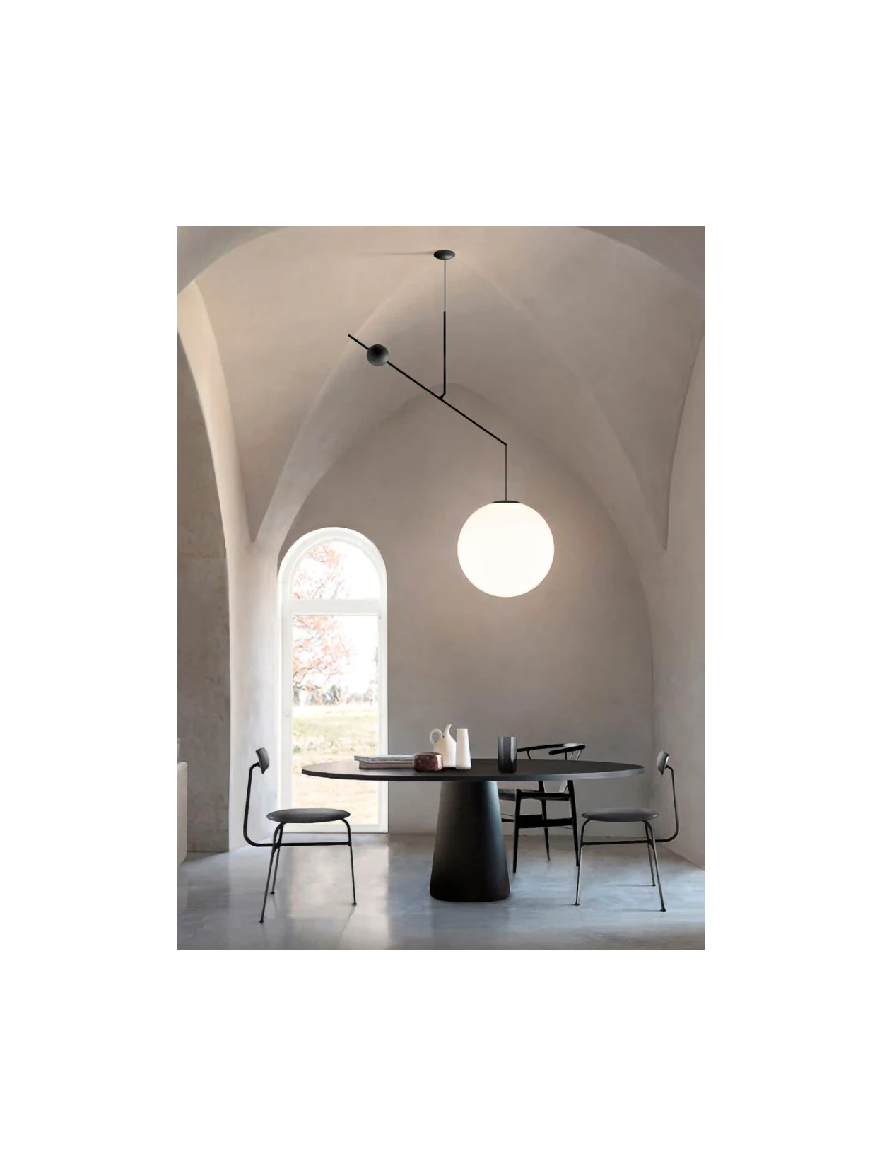 La struttura in acciaio verniciato nero dialoga con il diffusore in vetro soffiato opale, creando un contrasto raffinato e moderno. Disponibile nei diametri 22 cm (LED E14) e 48 cm (LED E27), Malamata si inserisce con naturale eleganza sopra tavoli da pranzo, isole cucina, living contemporanei e spazi contract dallo stile essenziale. Una sospensione scenografica che unisce estetica, funzionalità e libertà compositiva.