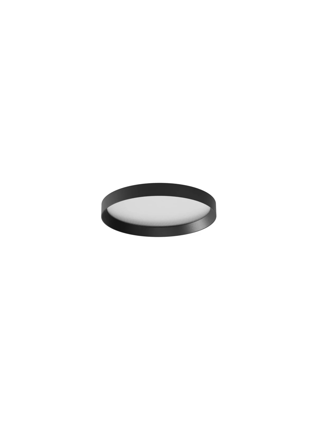Lampada da soffitto LED con struttura in alluminio pressofuso e metallo verniciato a polveri in finitura nero opaco e diffusore microprismatico in policarbonato.