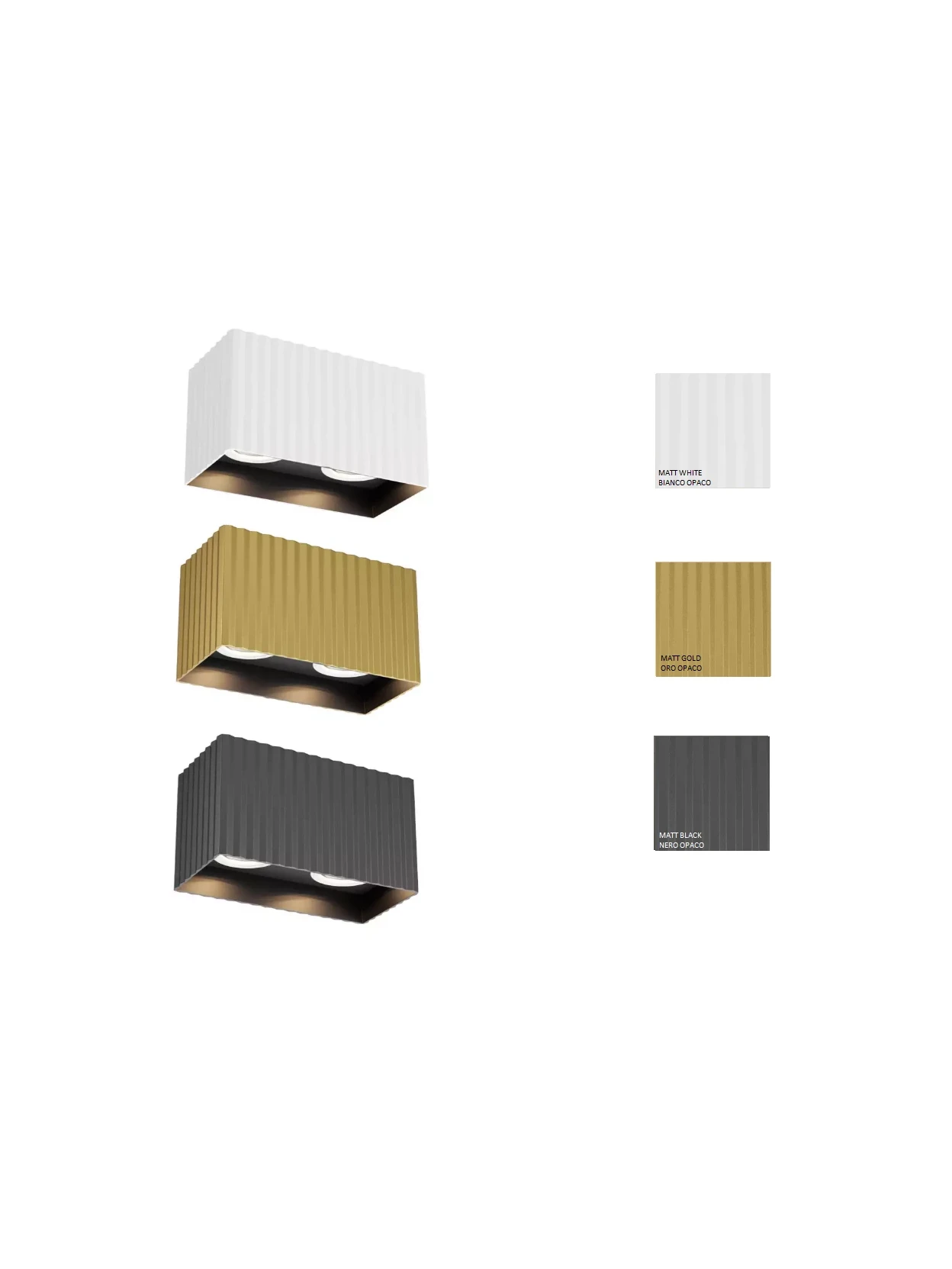 Lampada da soffitto doppia quadrata realizzata in metallo e alluminio anodizzato in finitura nero, oro o bianco opaco con interno nero.