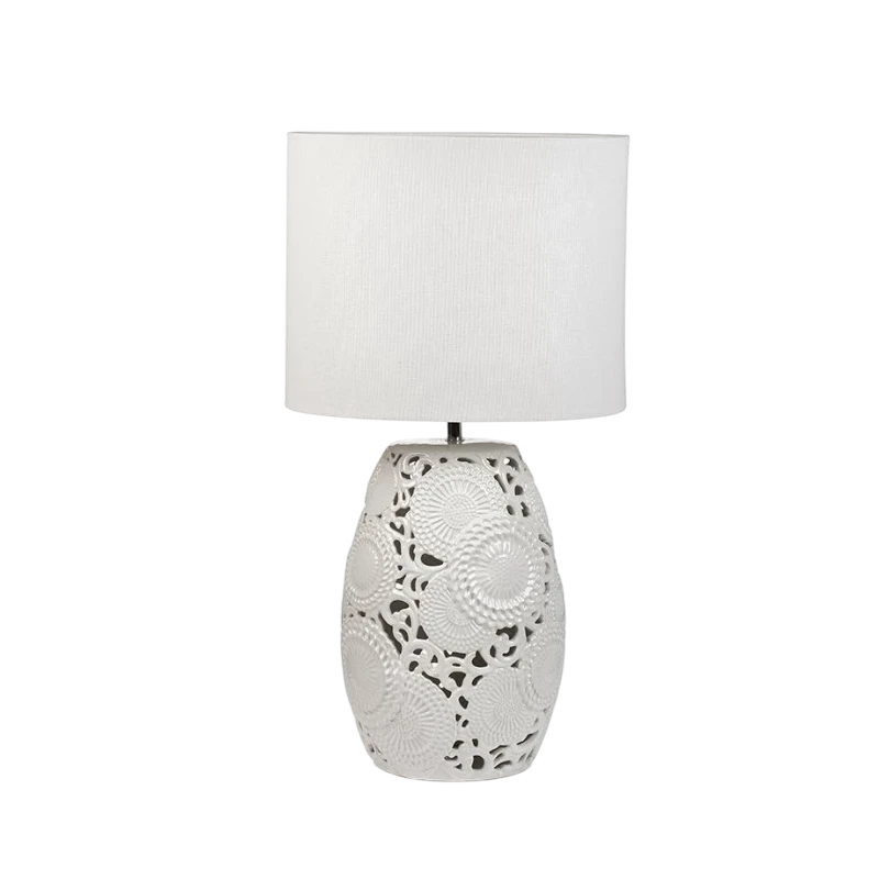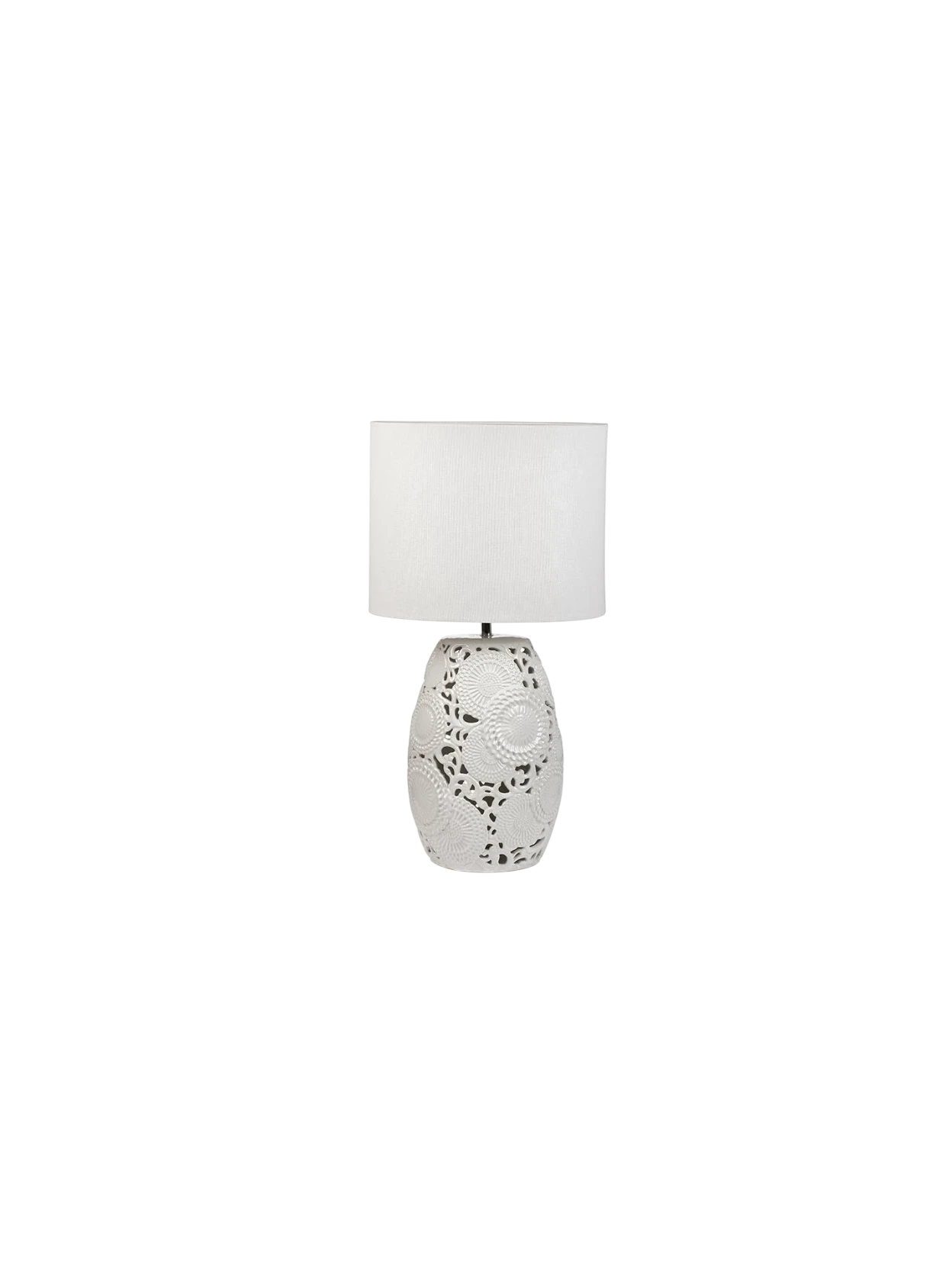 Lampada di Henriette della collezione Kyoto con base in porcellana bianca che ricorda il pizzo, elegante e raffinata.