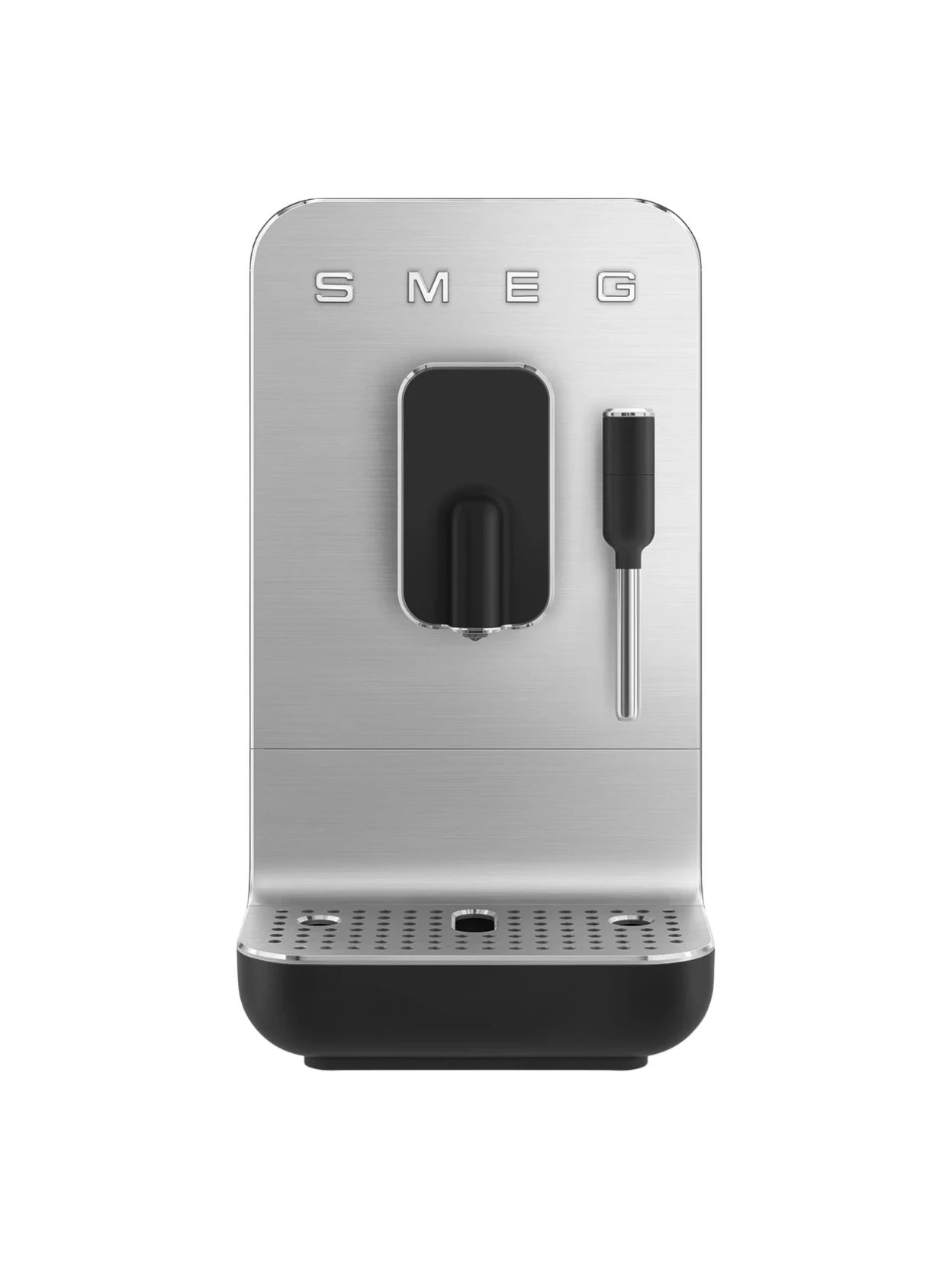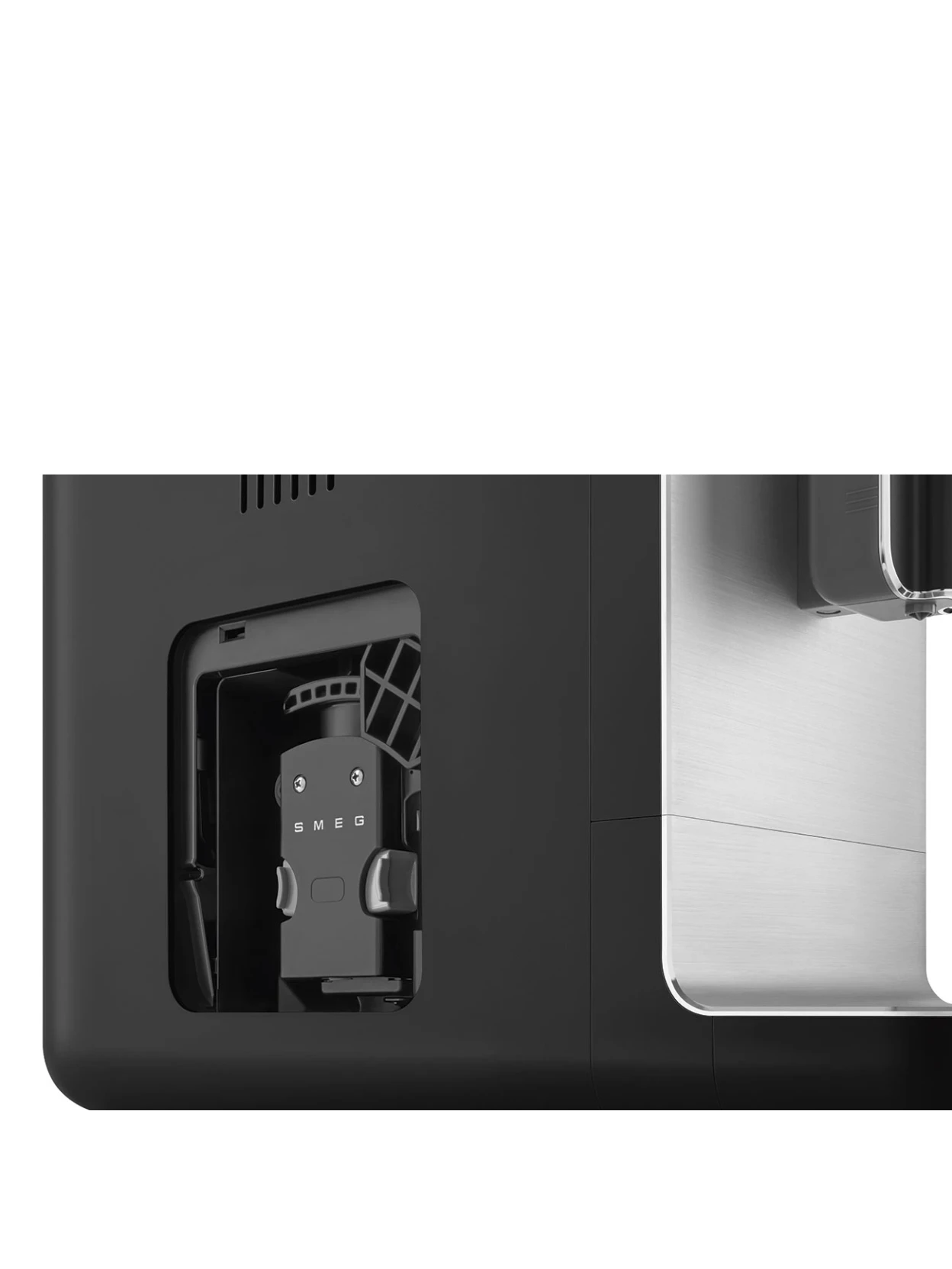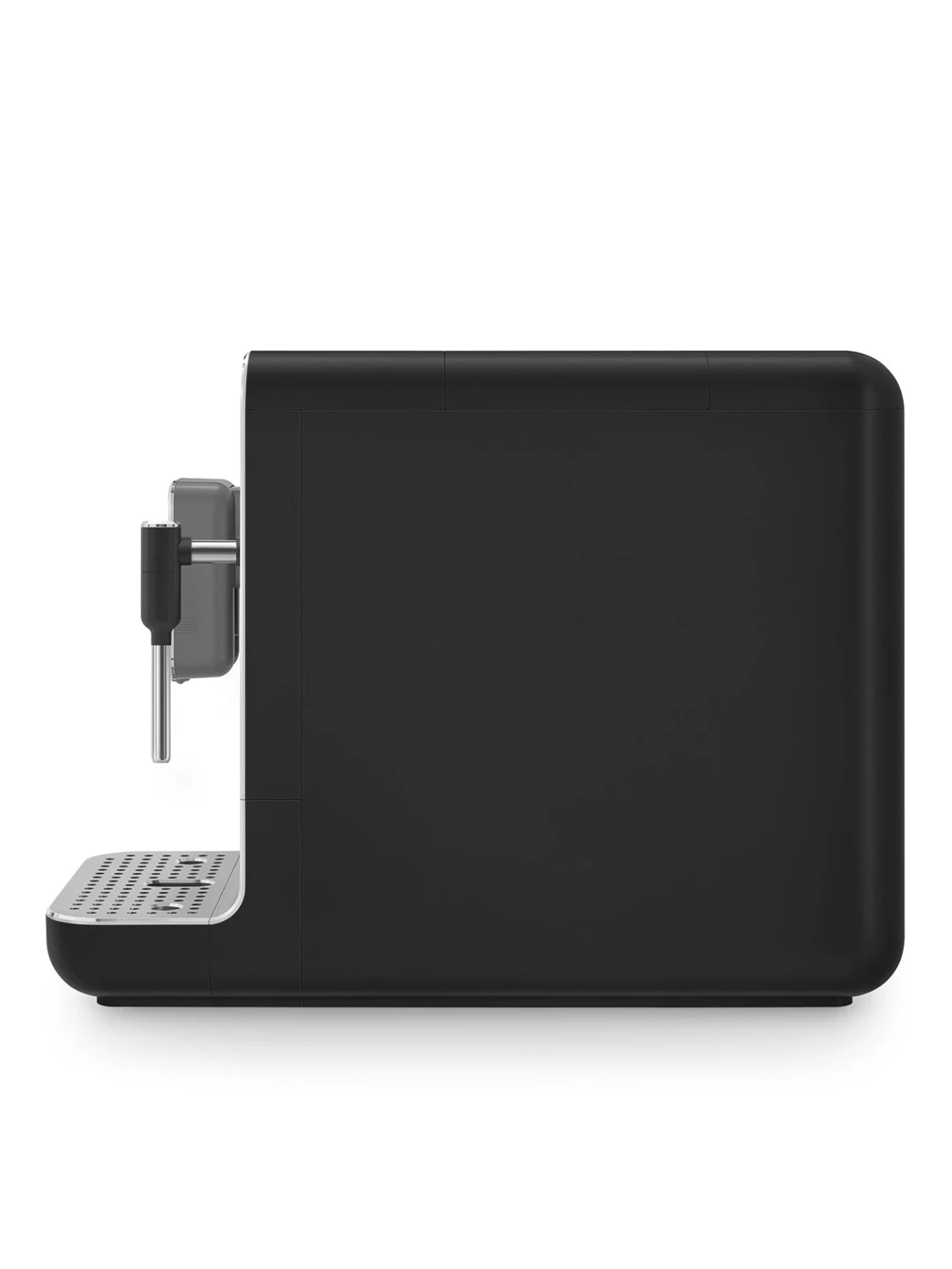 Macchina da caffè automatica Smeg in nero opaco: stile e prestazioni da bar direttamente a casa. Pompa 19 bar, macinacaffè integrato, lancia vapore in acciaio inox e serbatoio 1,4 L per espresso e cappuccino perfetti. Multibeverage con 6 bevande, acqua calda e funzione vapore.