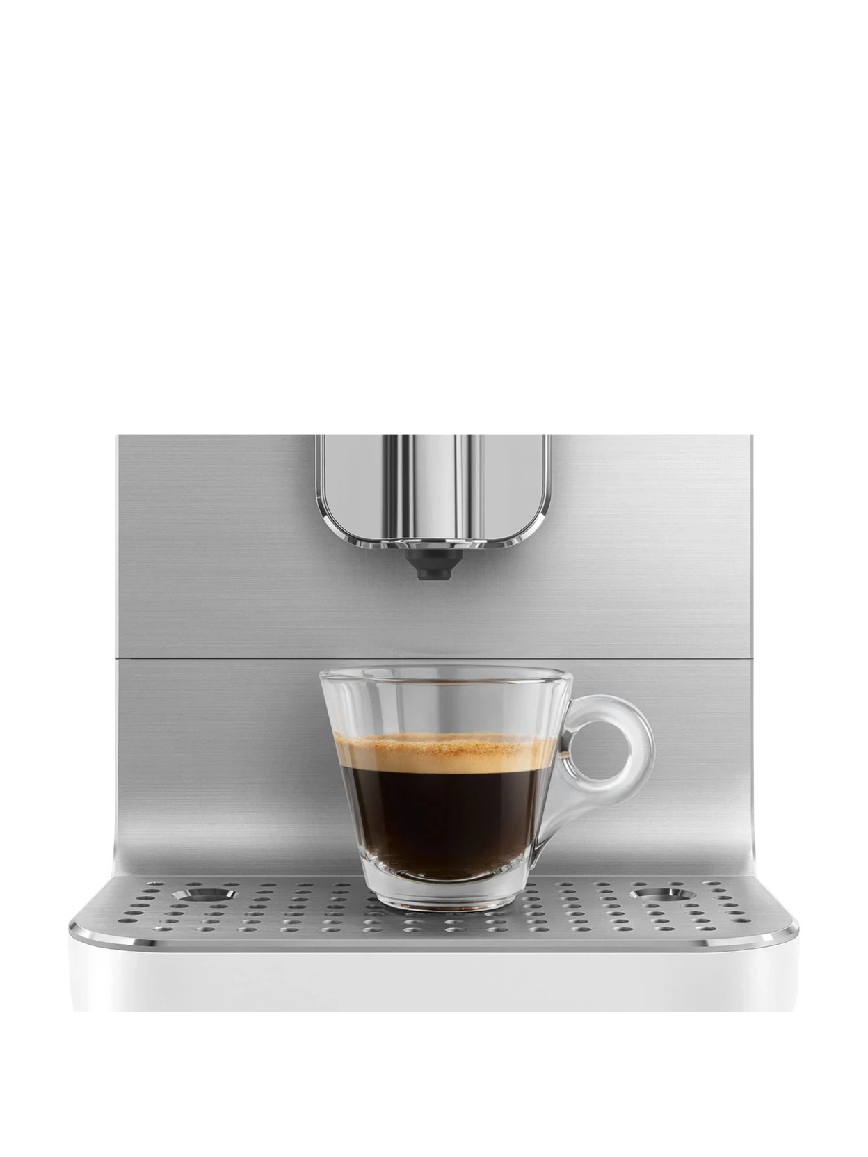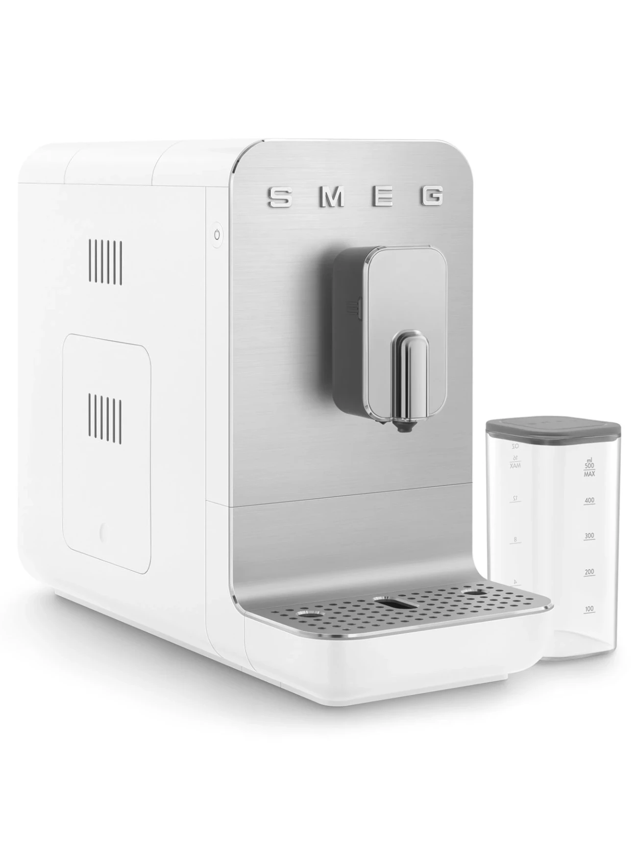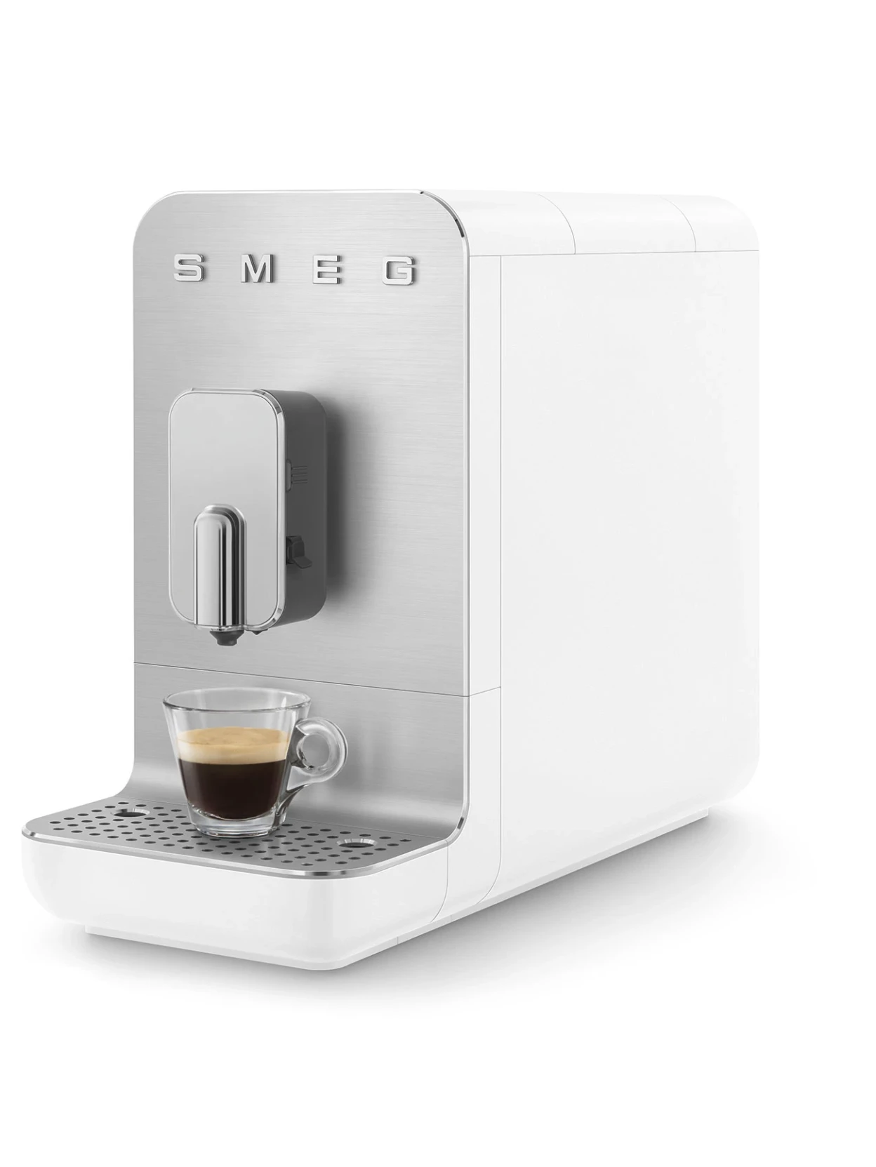 Macchina da caffè automatica BCC13 firmata Smeg in finitura bianca: stile elegante e prestazioni da bar a casa tua. Sistema latte integrato, pompa 19 bar, macinacaffè integrato e serbatoio 1,4 L per espresso, cappuccino e latte macchiato perfetti. Multibeverage con 5 bevande caffè e 4 bevande latte, più acqua calda.