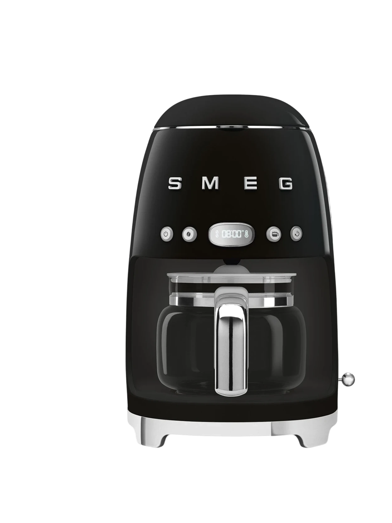 Macchina da caffè filtro DCF02 di Smeg della collezione 50’s Style in finitura nera: design iconico e gusto autentico. Prepara fino a 10 tazze di caffè filtro con intensità aroma regolabile, funzione Autostart e display LED con timer. Caraffa in vetro da 1,25 L e funzione Keep Warm fino a 40 minuti per un caffè sempre caldo.