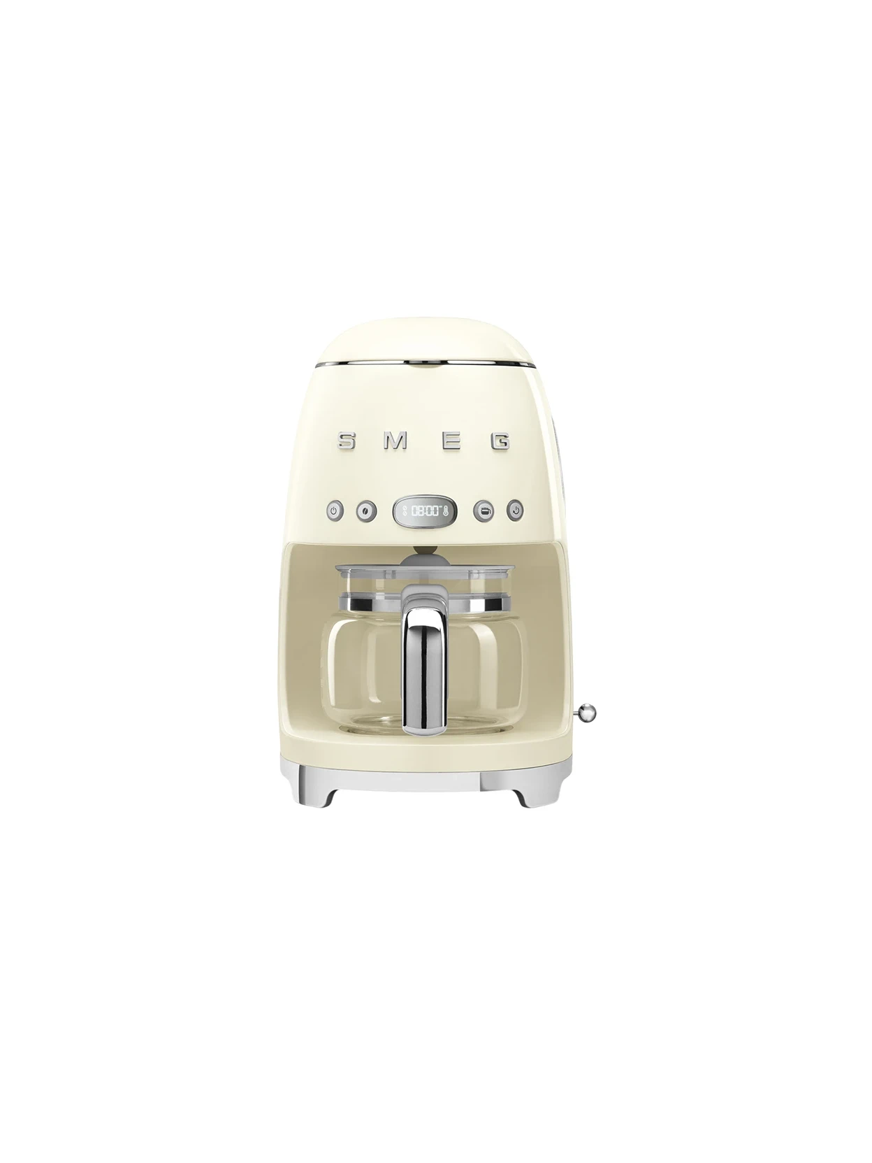 Macchina da caffè filtro DCF02 panna di Smeg della collezione 50’s Style: eleganza senza tempo e gusto autentico. Prepara fino a 10 tazze di caffè filtro con intensità aroma regolabile, display digitale con timer e funzione Auto Start. Caraffa in vetro da 1,25 L e funzione Keep Warm fino a 40 minuti per un caffè sempre caldo.