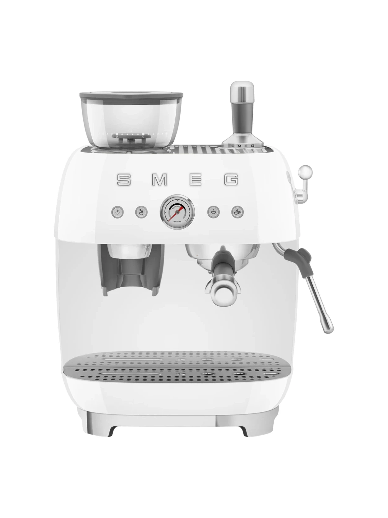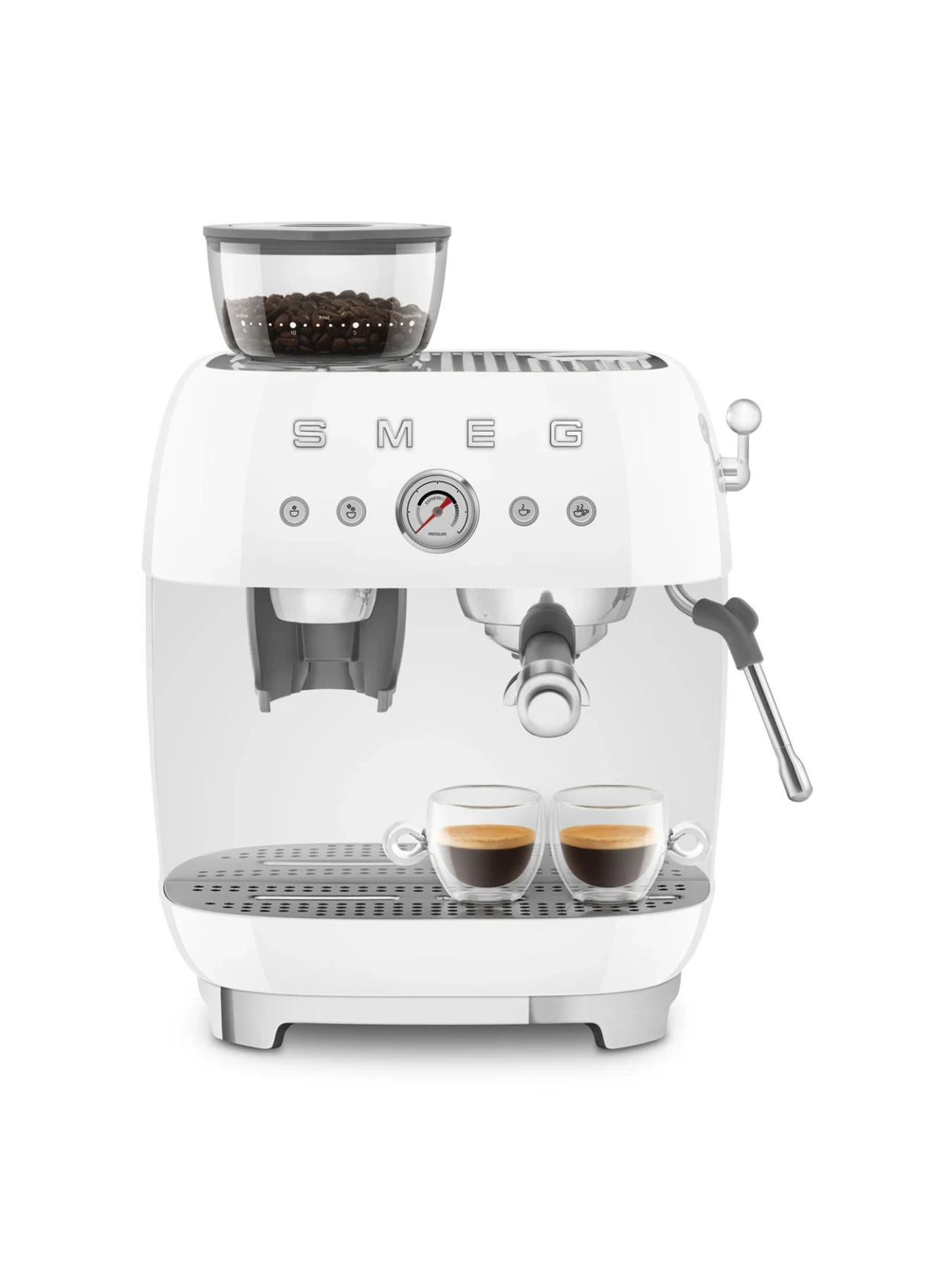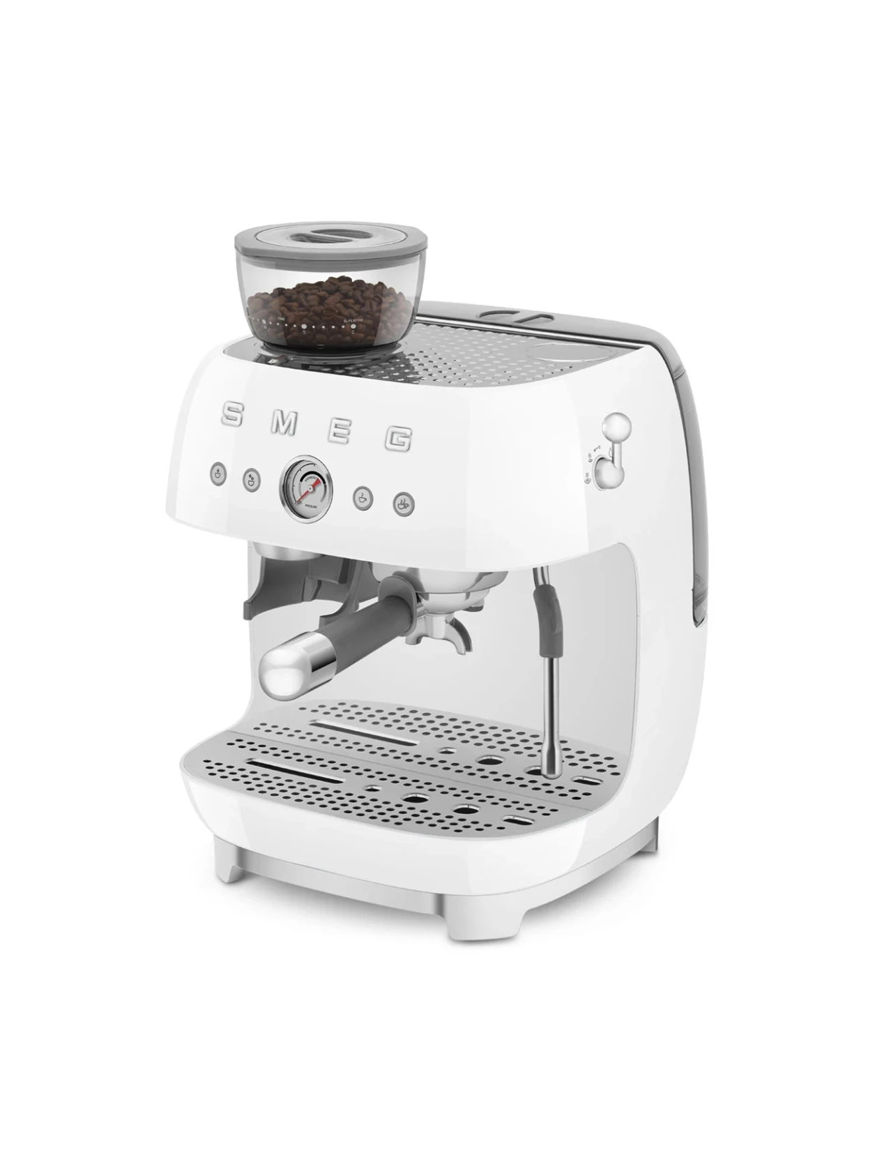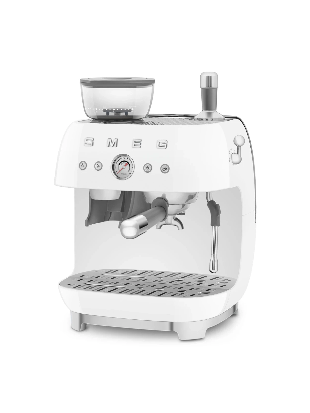 Eleganza senza tempo e prestazioni professionali in un’unica macchina espresso manuale con macinacaffè integrato. Pompa da 20 bar, doppio Thermoblock e portafiltro professionale da 58 mm, racchiusi nell’iconico design anni ’50 Smeg in raffinata finitura bianca.