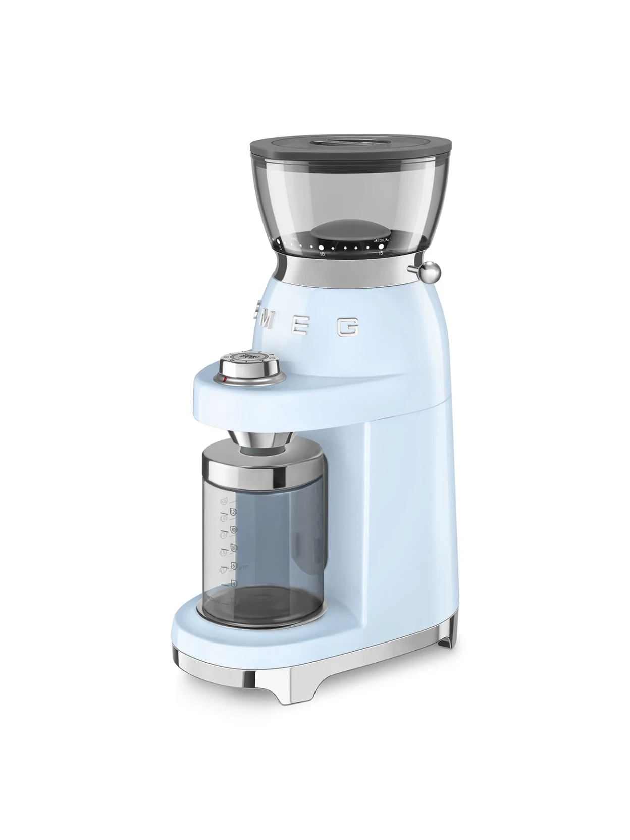 Il macinacaffè Smeg azzurro 50’s Style trasforma ogni chicco in caffè fresco dal gusto autentico. Con 15 livelli di macinatura regolabili e macine coniche in acciaio inox, è perfetto per espresso, caffè filtro e bevande personalizzate. Il design retrò in azzurro aggiunge un tocco elegante e originale alla cucina.