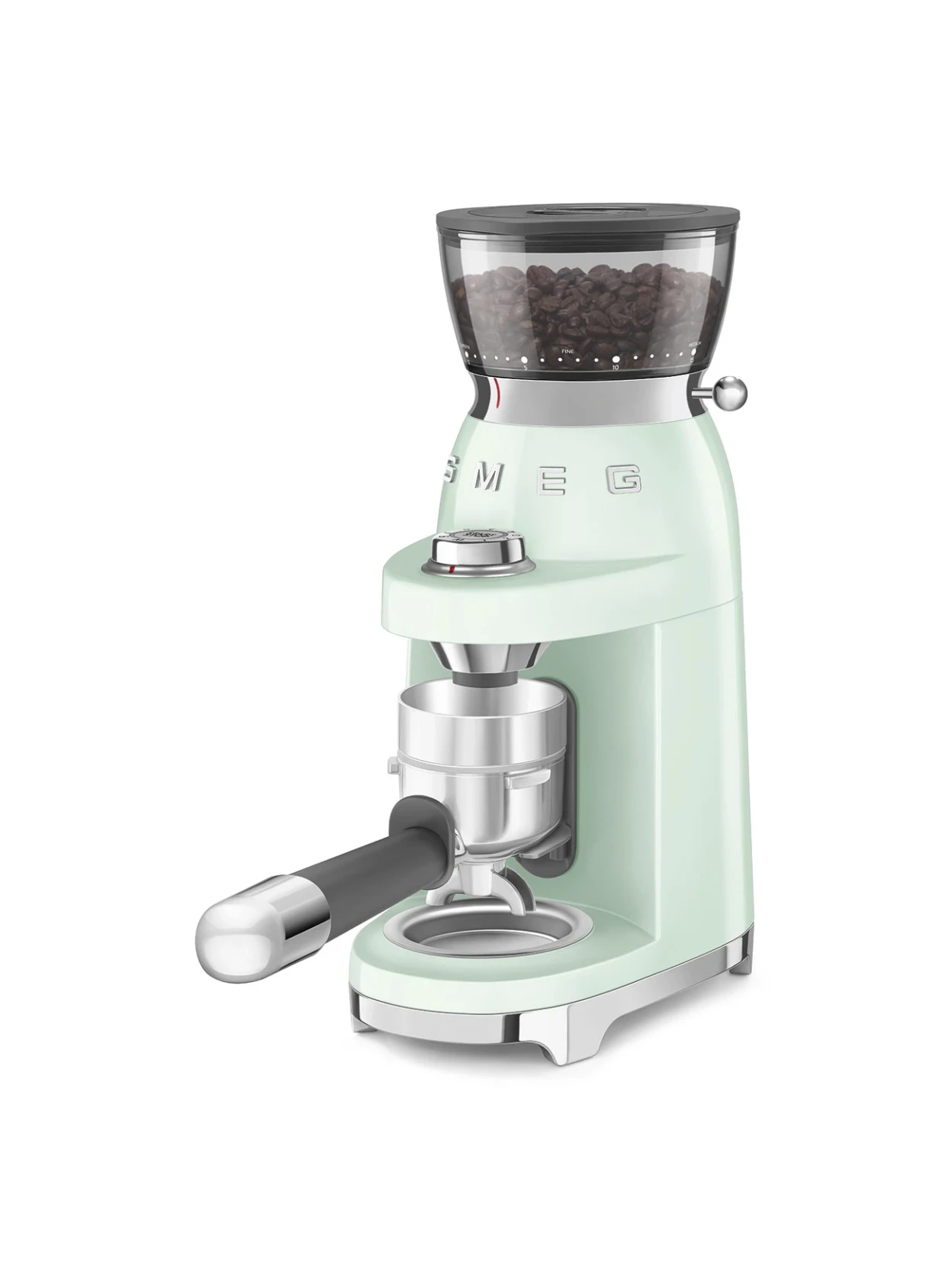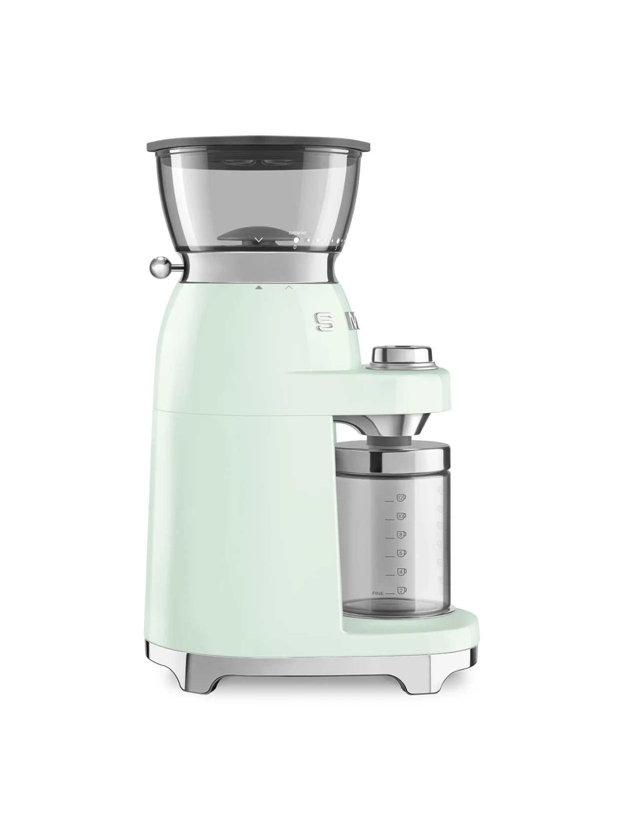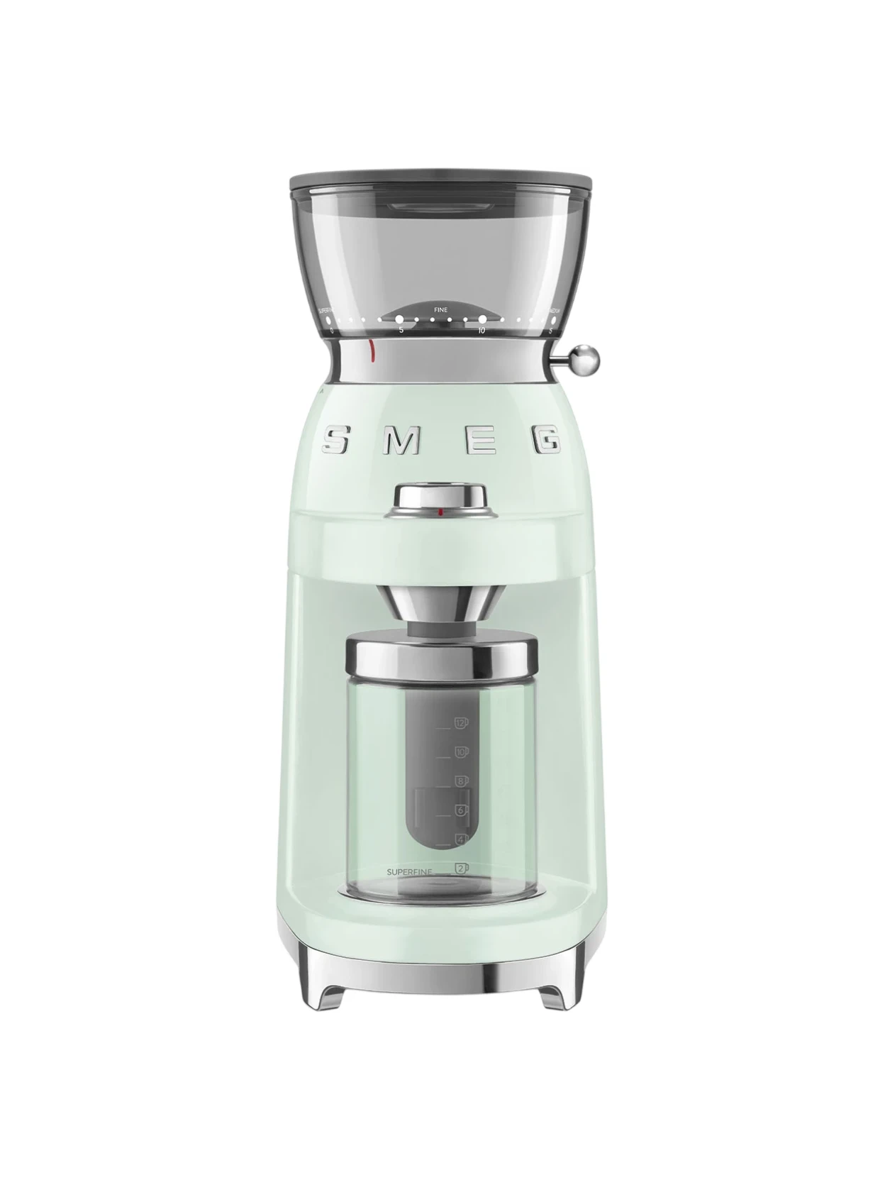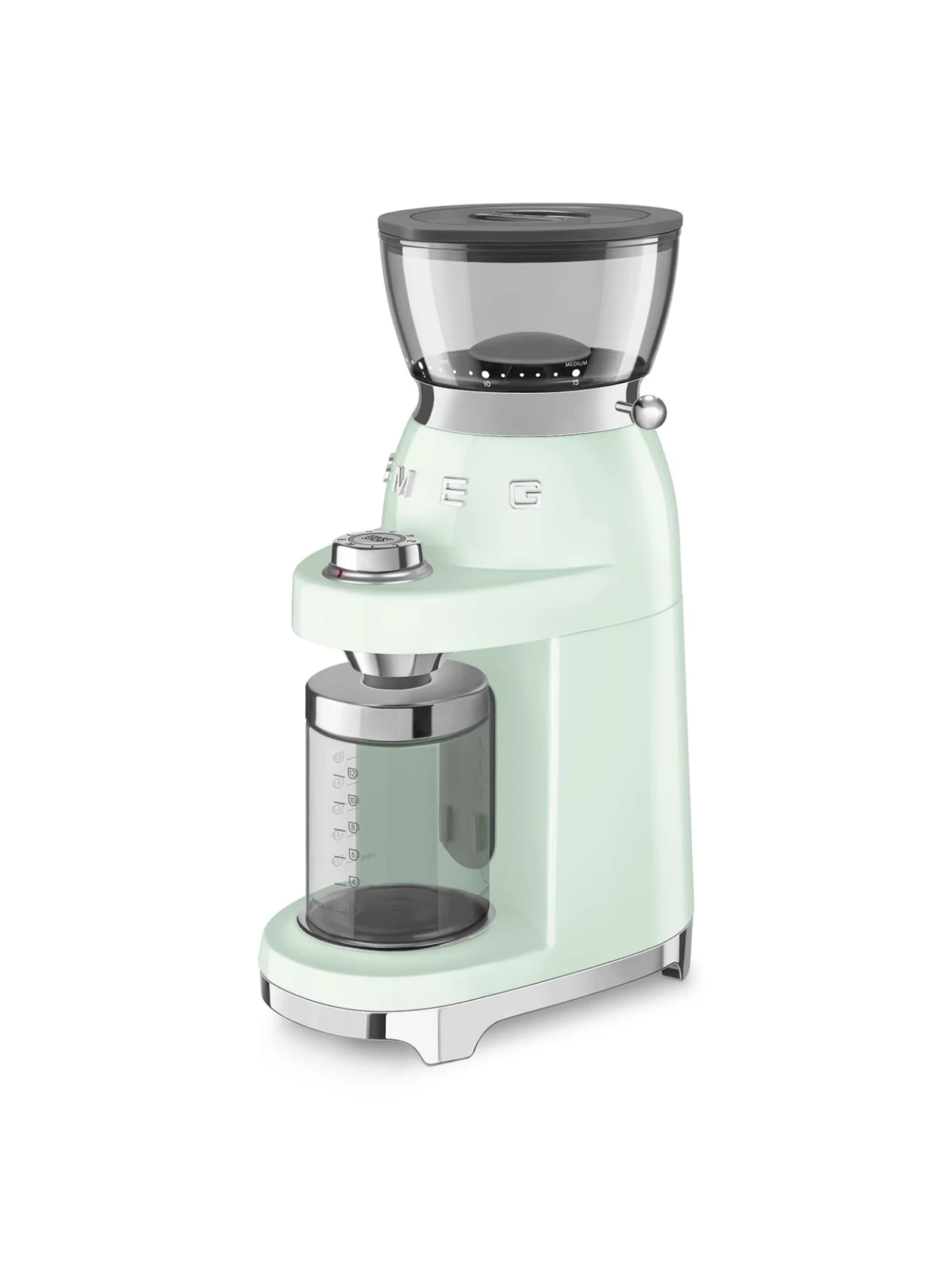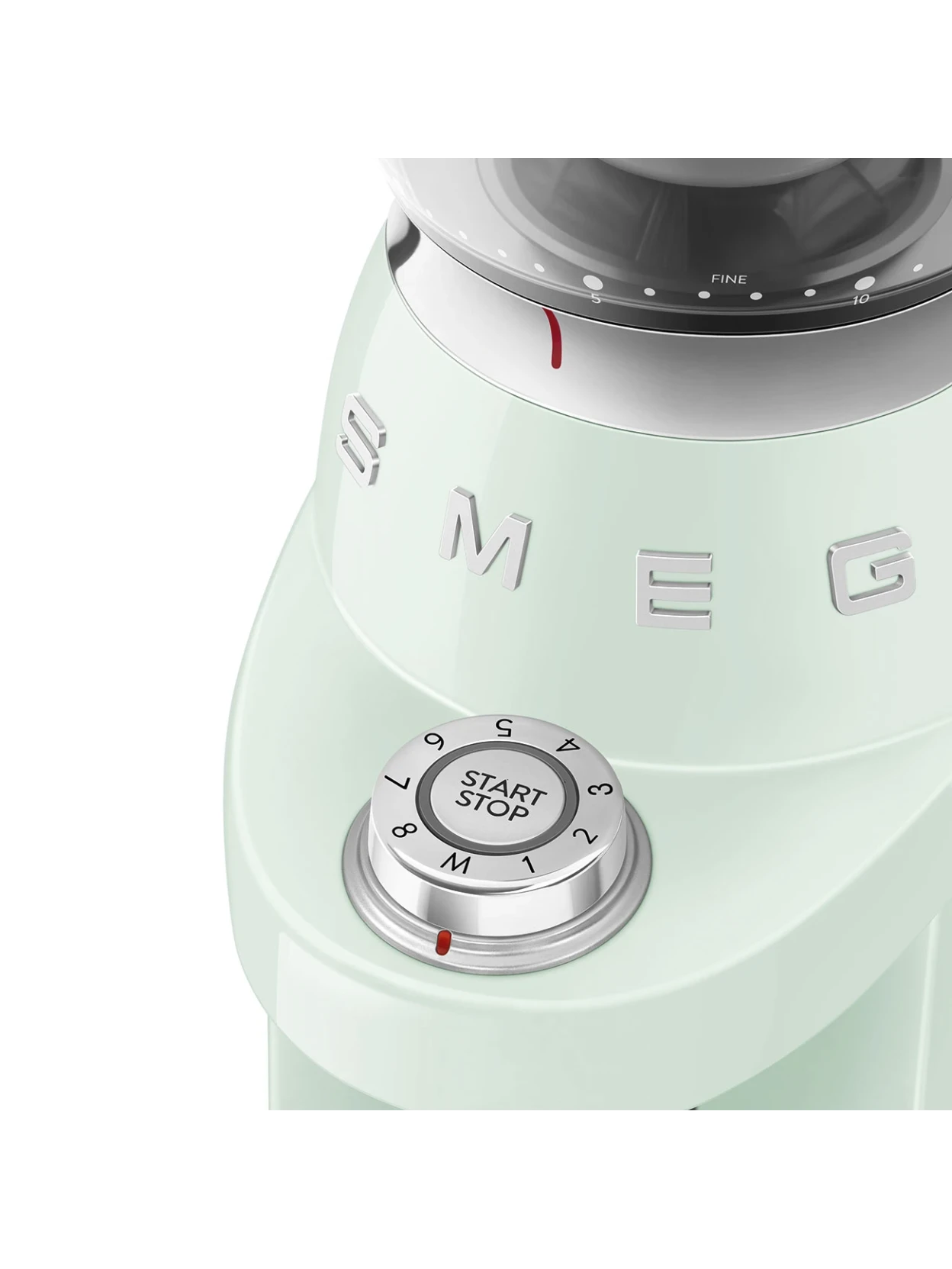 Il macinacaffè Smeg verde pastello 50’s Style trasforma ogni chicco in caffè fresco dal gusto autentico. Con 15 livelli di macinatura regolabili e macine coniche in acciaio inox, è perfetto per espresso, caffè filtro e bevande personalizzate, aggiungendo un tocco elegante e delicato alla cucina.