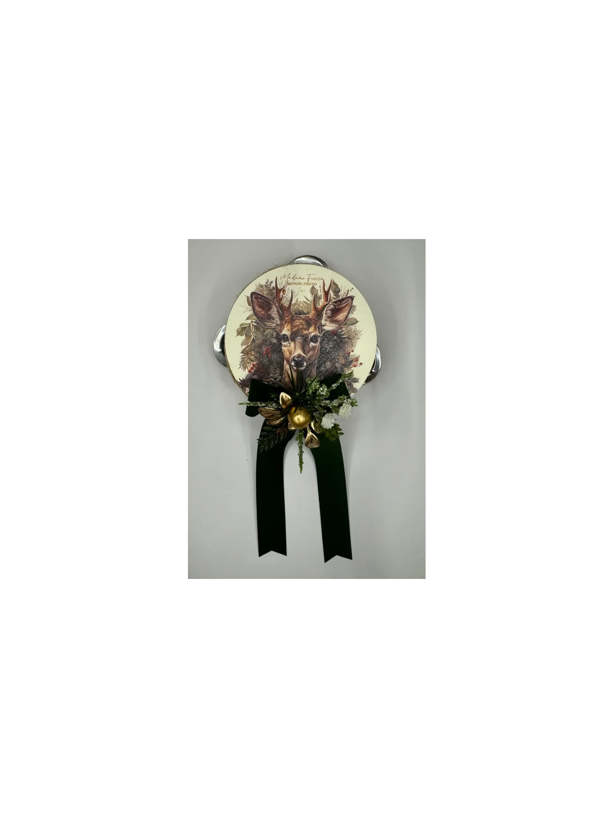 Tamburello decorativo Bosco Incantato di Madame Fioccò, con raffigurazione di un cervo ed impreziosito da un fiocco in velluto verde, rametti e bacche dorate. Perfetto come decorazione elegante e natalizia o come regalo.
