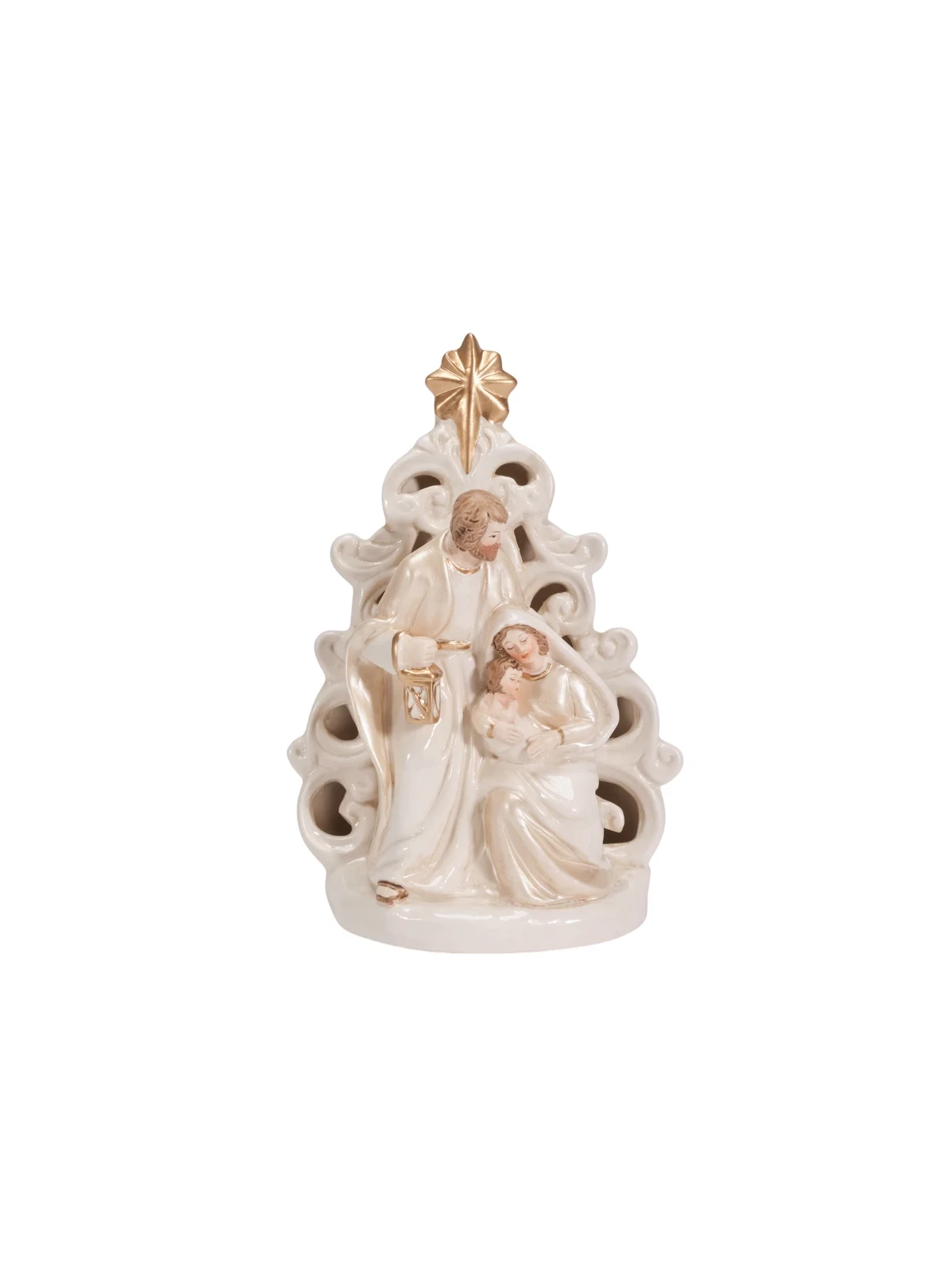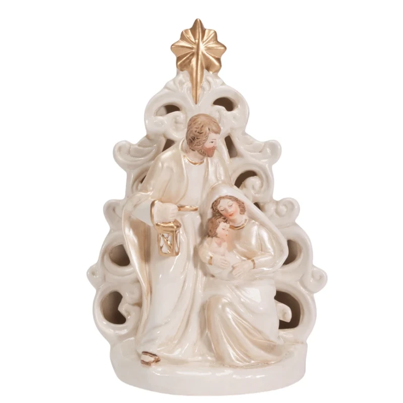 Elegante decorazione natalizia in ceramica con luce integrata. Raffigurazione raffinata della Sacra Famiglia, perfetta per creare un’atmosfera calda e spirituale durante le feste.