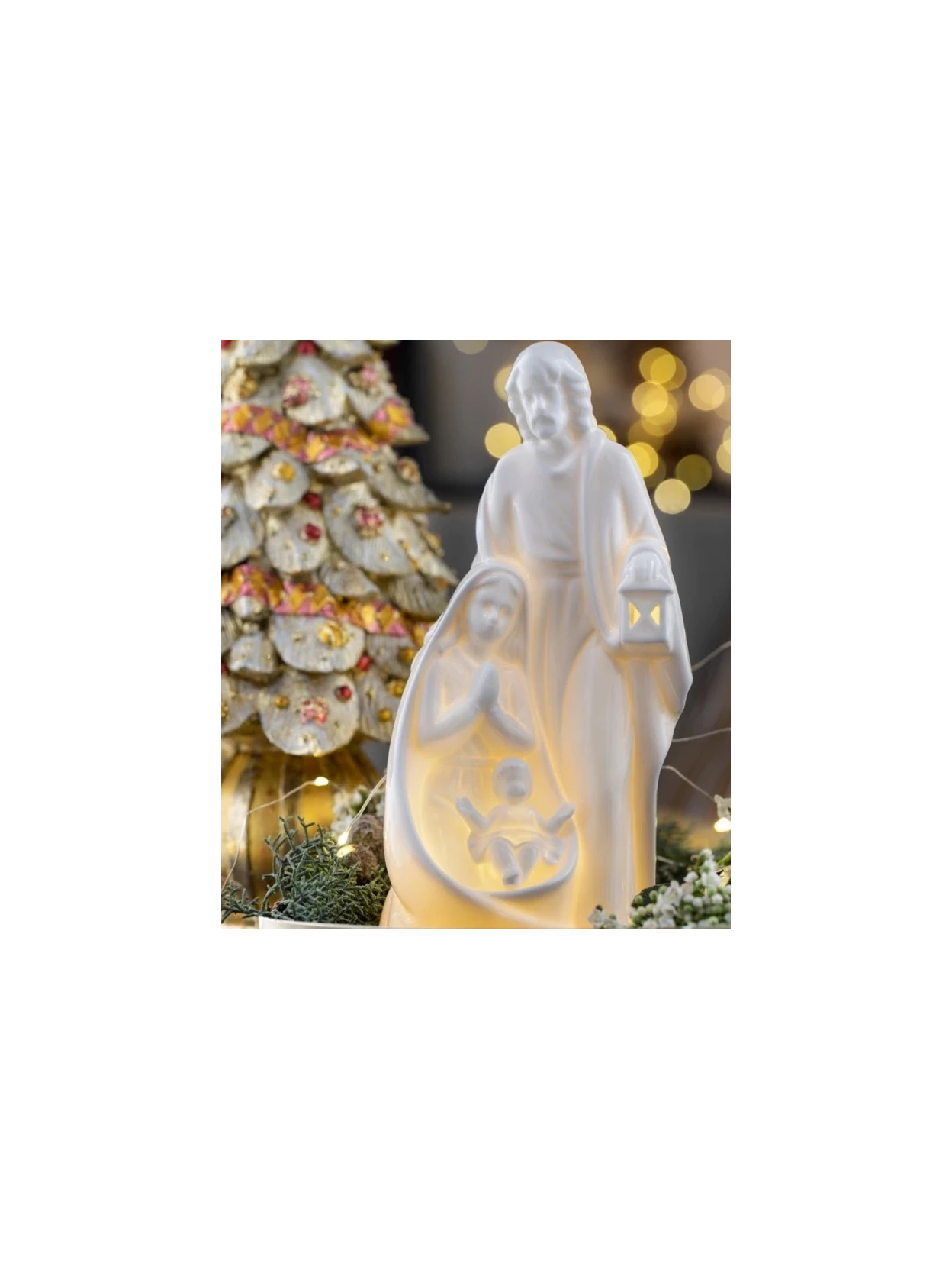 Elegante decorazione che raffigura la natività firmata Henriette. Realizzata in ceramica bianca con luce LED. Un raffinato complemento d’arredo natalizio che illumina con dolcezza la tua casa.