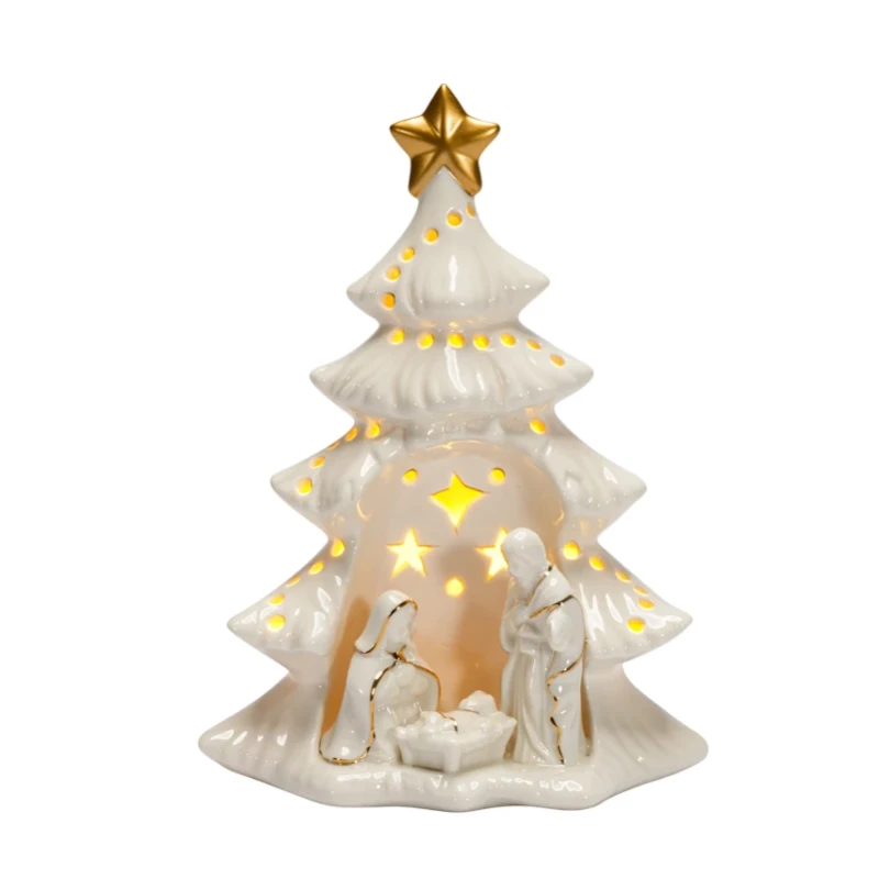 Elegante natività Henriette con luce, finitura bianca e dettagli oro. Un raffinato decoro natalizio che illumina con dolcezza la tua casa.