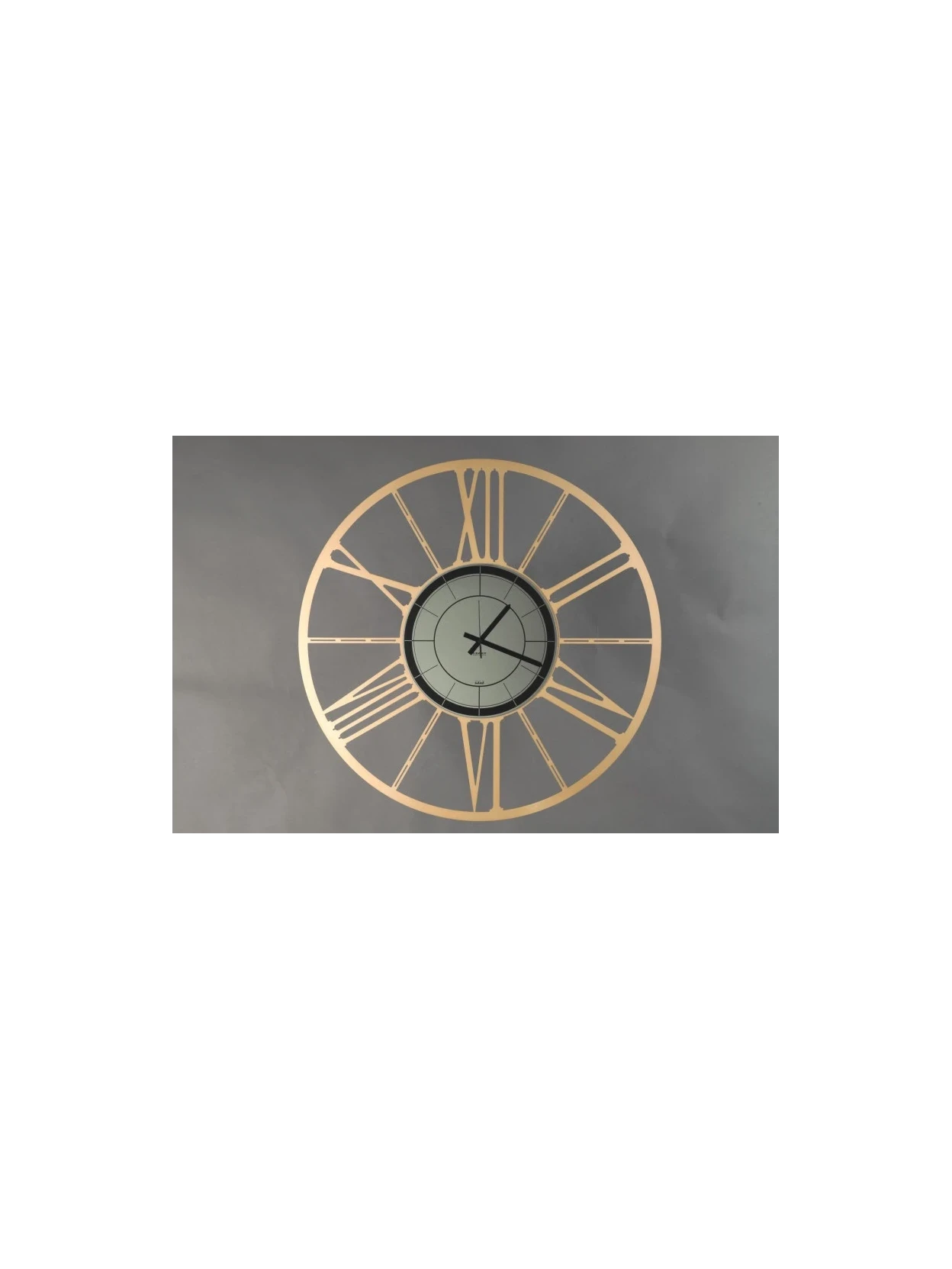 Ruota black edition è un orologio da parete moderno in metallo oro metallizzato con quadrante in vetro specchiato nero fumé. Numeri romani eleganti, design contemporaneo e qualità artigianale italiana. Disponibile nei diametri 50 cm, 80 cm e 100 cm.