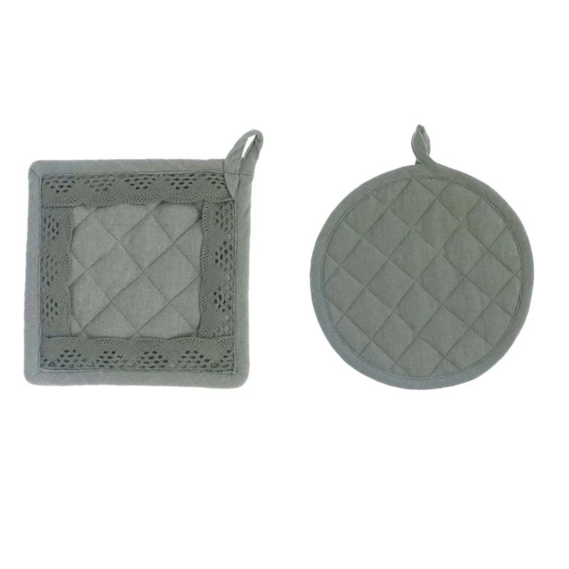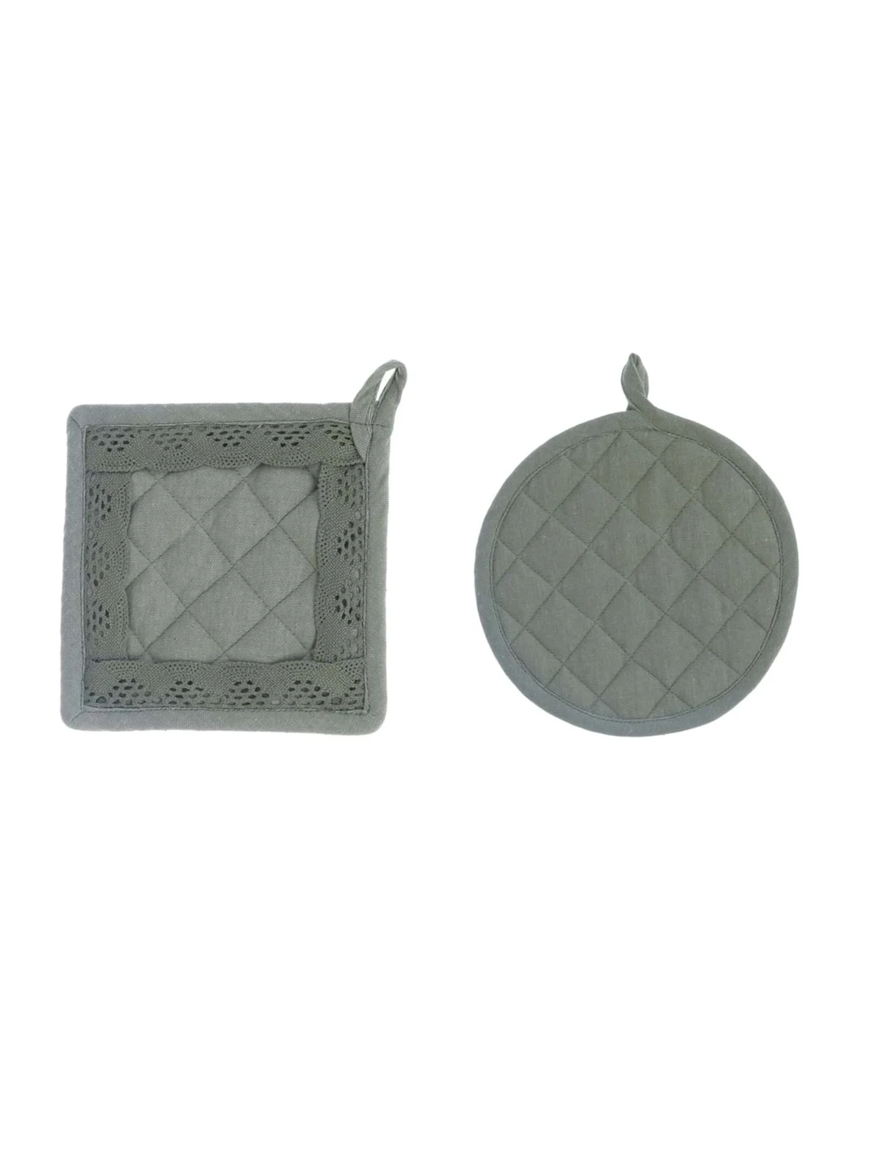 Set di 2 presine da cucina, una rotonda Ø 20 cm e una quadrata 16x16 cm impreziosita da un raffinato bordo in merletto tono su tono. Collezione Nuovo Infinity, in elegante color verde, perfette per aggiungere stile e praticità alla tua cucina.
