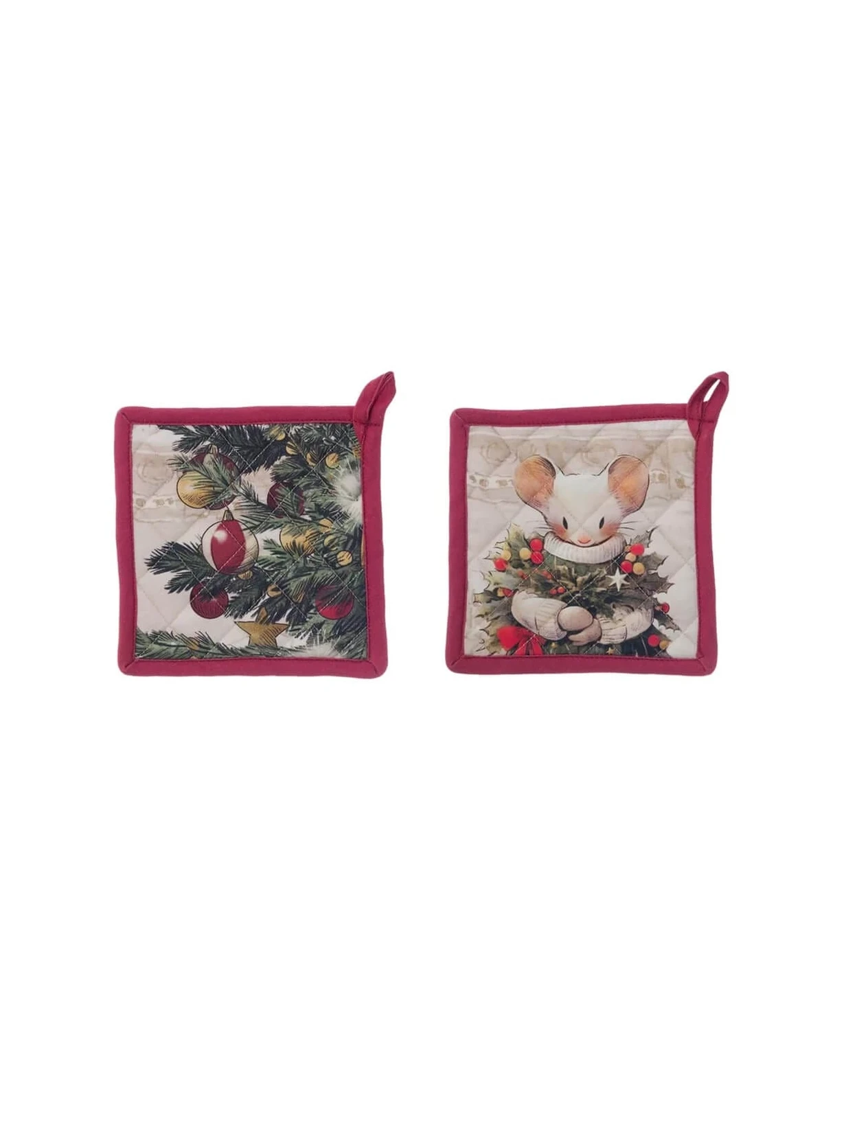 Presina di Blanc MariClò della collezione Favola di Natale in 100% cotone, 20x20 cm. Fronte con albero di Natale stampato e retro con fiocchi rossi.