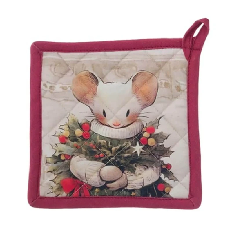Presina di Blanc MariClò della collezione Favola di Natale in 100% cotone, 20x20 cm. Fronte con dolce topino stampato, retro con fiocchi rossi.